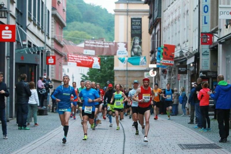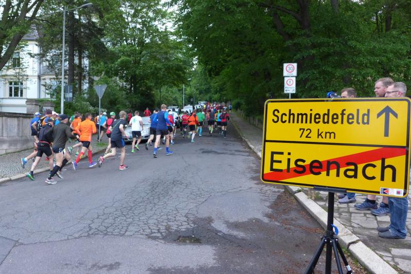Ganz „lange“ dabei waren die Ultraläufer, die bereits frühmorgens um 6:00 Uhr in Eisenach an den Start gingen. Beim hinauslaufen aus der Stadt deutete ein Ortsausgangsschild erbarmungslos auf das 73,5 Kilometer entfernte Schmiedefeld hin. Und als wäre das nicht genug, sollte es für die nächsten 25 Kilometer mit dem Ziel Großer Inselsberg, erst einmal nur bergauf gehen.