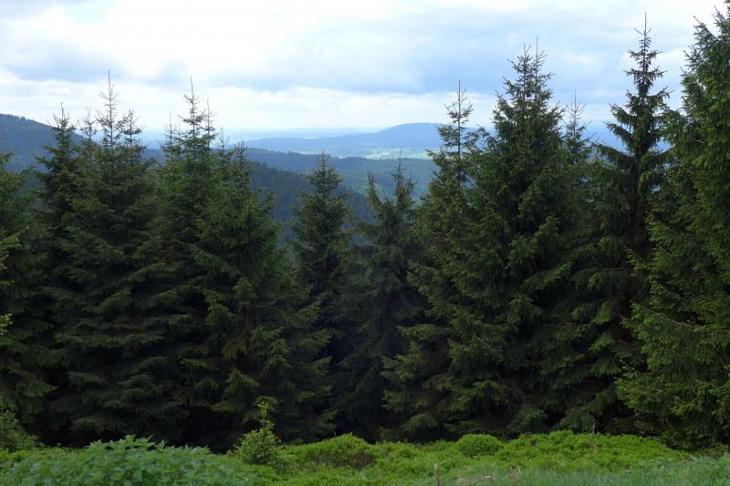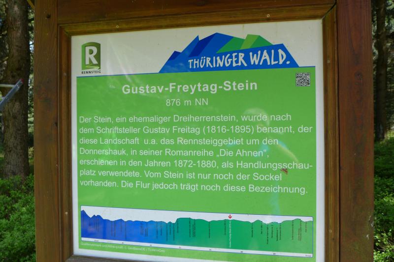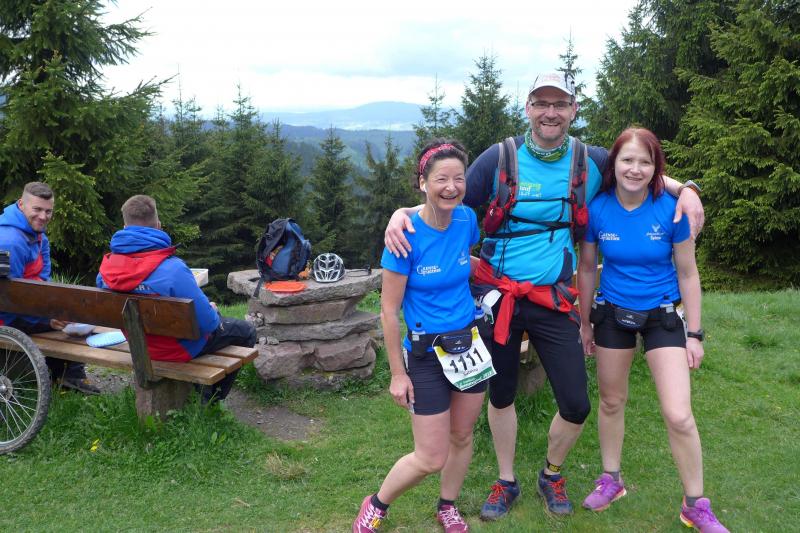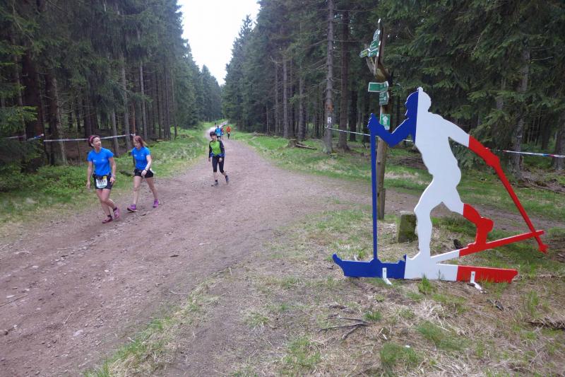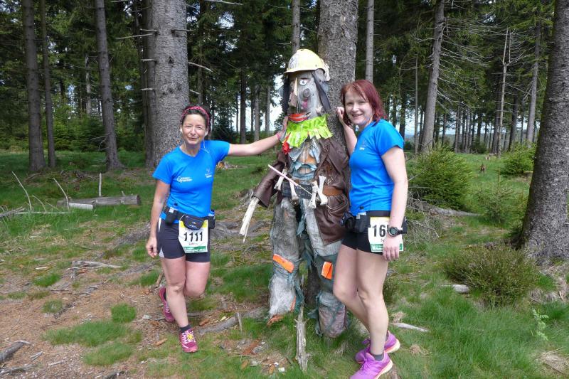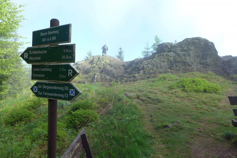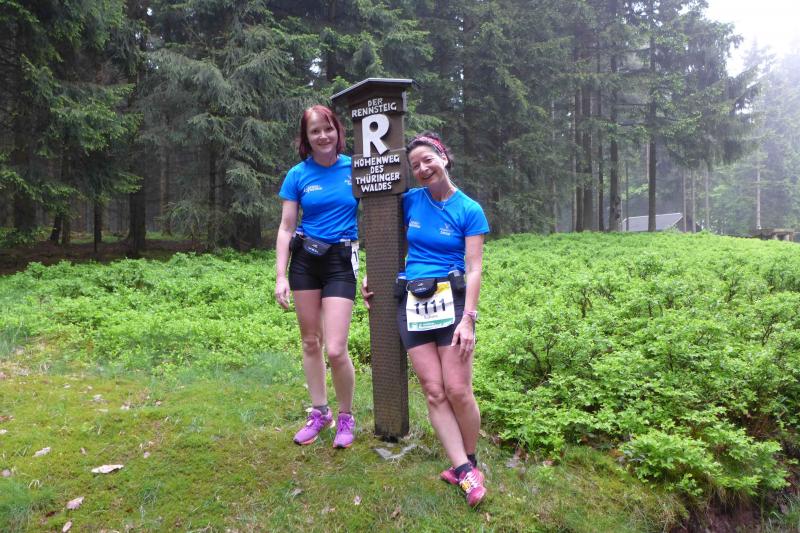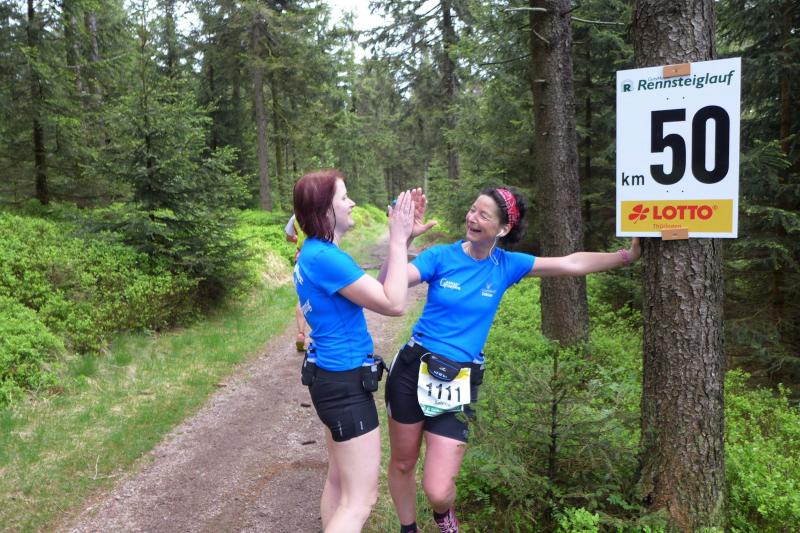 Mit "Hoher Schorn" auf 850 Metern war dann der dritthöchste Aussichtspunkt der Strecke erreicht. Schnell ein Foto mit Uwe vom Team Frankenwild, denn Uwe war an einem ganz anderen Punkt angekommen. Er wollte schlicht und ergreifend aufgeben, hatte genug gesehen vom Höhenweg des Thüringer Waldes, ihm tat einfach alles weh. Da hatte er aber die Rechnung ohne die Bode-Runners gemacht, die alles daran setzten, ihn wieder auf Trab zu bringen. Die Karawane zog weiter und euphorisch wurde das Kilometerschild „50“ gefeiert!