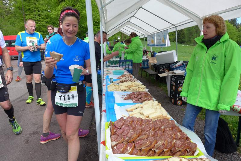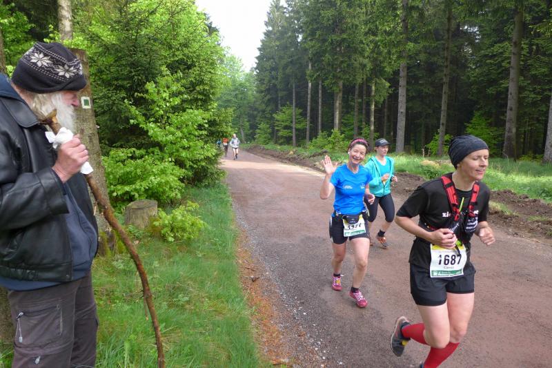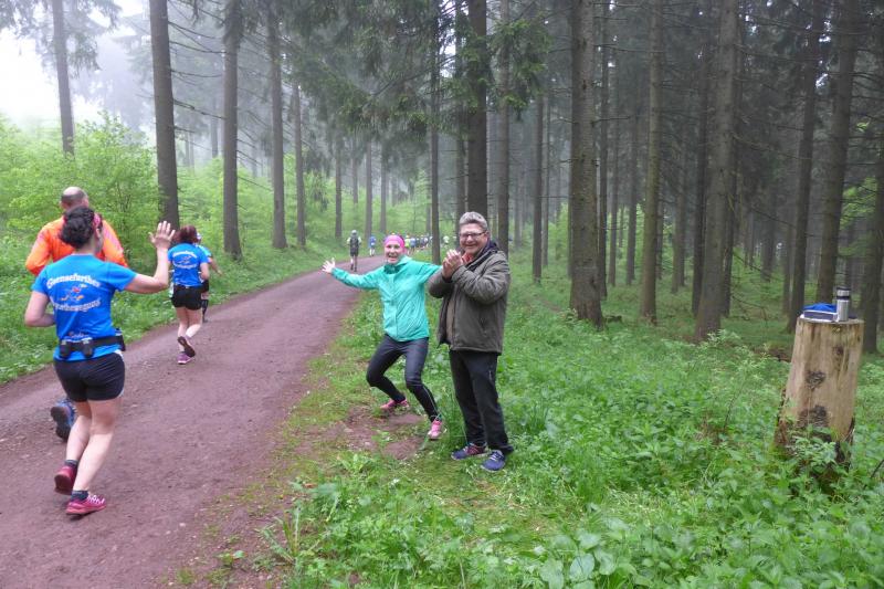 Kein Zeitlimit hatten sich Sylvia Köhn und Sabine Börner gesetzt. War Börner mit ihrer Zeit von 08:48 Stunden vor drei Jahren selig, galt bei ihr das Motto genießen, motivieren und ankommen. Bereits mit Übergabe der Startnummer mit den Ziffern „1111“ resümierte sie gelassen: „Das wird mein Lauf!“ Köhn schloss sich gerne den Routiniers an. Bei der Harzquerung über 51 Kilometer hatte sie erste Erfahrungen mit einem Ultralauf gemacht, mehrere Marathons galten der Vorbereitung, alles und allein dafür, diese Strecke durchzuhalten. An der Ebertswiese bei Kilometer 37,5 spürten viele Läufer schon einmal nach. Hier war die Hälfte bereits geschafft, reichte die Kraft aber für den Rest der Strecke? Mit der Verpflegung in der Hand wurde der nächste Berg von vielen nur noch im schnellen Schritt gegangen. Leises Gestöhne und schmerzverzogene Gesichter hielten die Fotografen an der Steigung für die Ewigkeit fest, bevor die Beine wieder im gleichmäßigen Rhythmus laufen konnten.