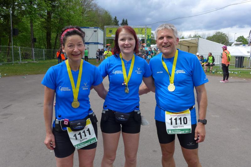 Bei den Gaensefurthern lief alles gut. Katrin Winkler-Hindricks hatte sich erwartungsgemäß mit Dirk Meier ins vordere Feld abgesetzt. Jörg Schäper konnte trotz geringerer Trainingsläufe lange mit den beiden mithalten und fand am Ende sein eigenes Tempo. Jens-Uwe Börner verausgabte sich wie immer auf den ersten 30 Kilometern um genügend Fotos von den Spitzenläufern einzusammeln. Erst dann lies er sich zurückfallen um mit dem Köhn-Börner-Duo den Rest des langen Weges zu bestreiten.
