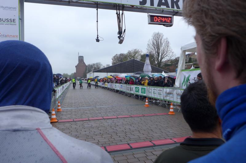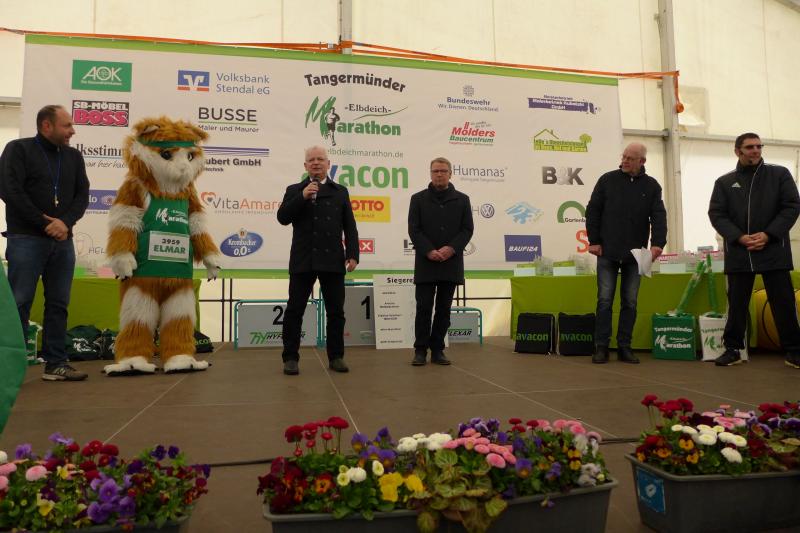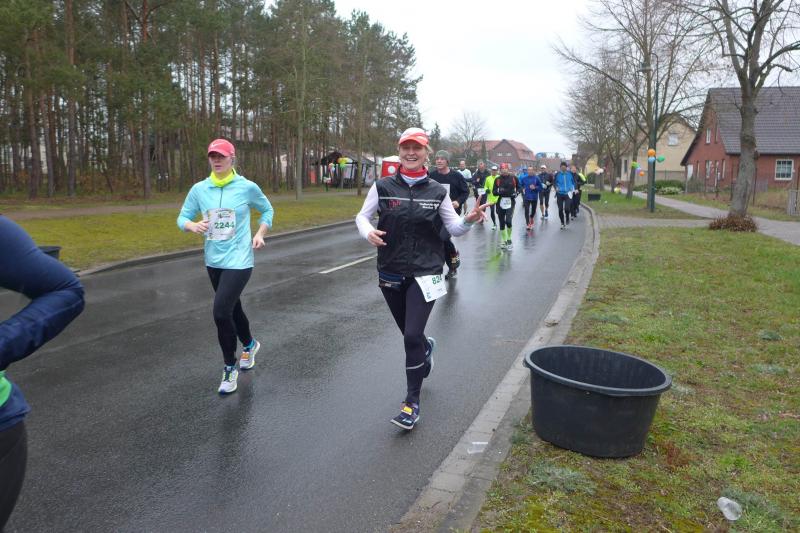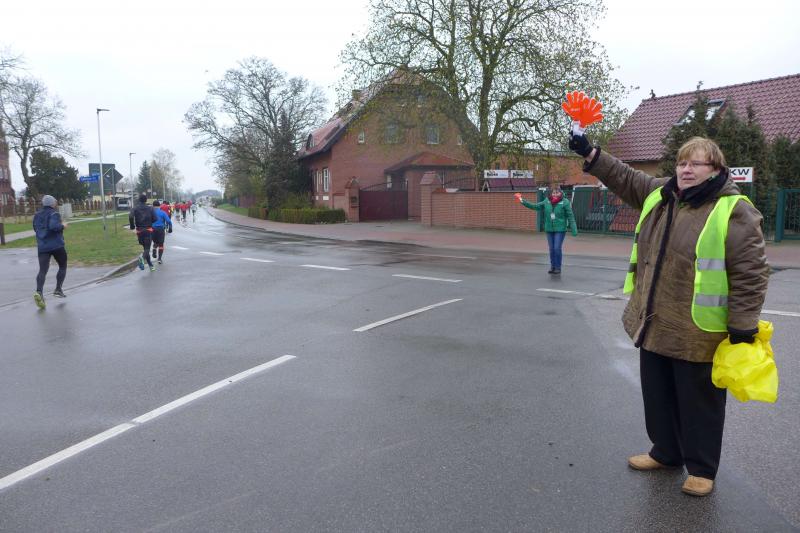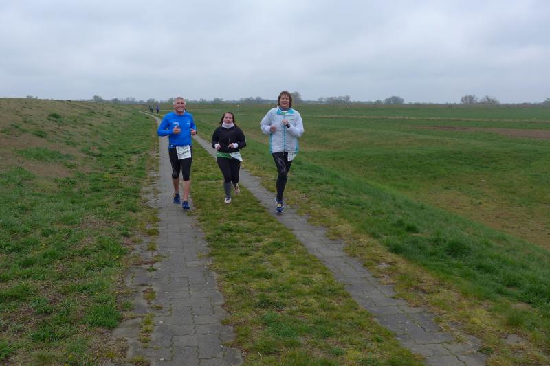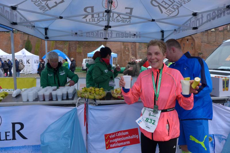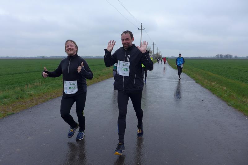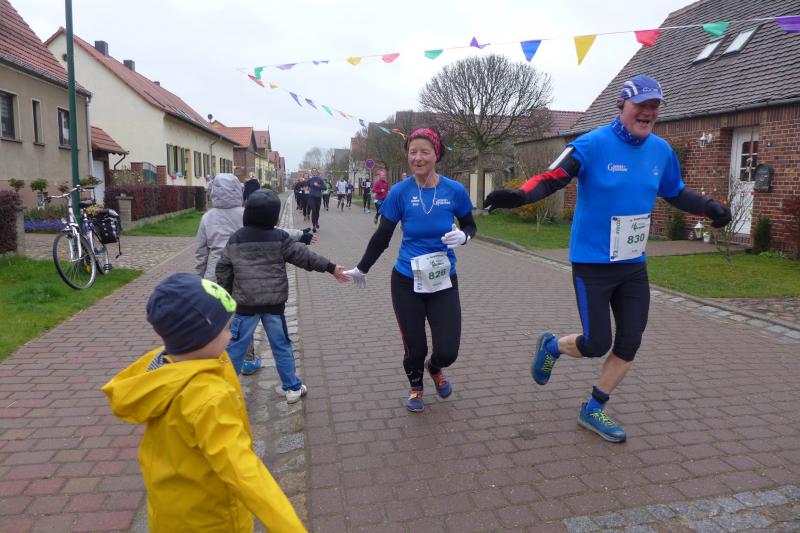 Die Regeneration war noch nicht abgeschlossen und der Muskelkater noch garnicht da, als die Läufer am nächsten Morgen bereits beim Tangermünder Elbdeich Marathon an der Startlinie standen. Statt der Sechs waren nun ganze 15 Gaensefurther vertreten. Das ungemütliche Wetter setzte noch einen drauf, denn es regnete an diesem Sonntag besonders schön. Läufern macht das in der Regel nichts aus. Doch nun standen 1.800 Läufer im Pulk frierend am Start, da halfen warme Gedanken auch nicht mehr. Doch dann ging es los – auf zehn Kilometer am Deich entlang oder auf eine Halbmarathon-Runde über Bölsdorf , Buch und Schelldorf bis zurück in die Hansestadt Tangermünde. Über die Marathondistanz hatten die Bode-Runners diesmal keine Läufer am Start. Der Regen war im Ziel fast gänzlich vergessen und auch dem böigen Wind hatte man die kalte Schulter gezeigt. Fast alle Finisher über die 21,1 Kilometer landeten eine Zielzeit um die zwei Stunden. Auch Renate Liedtke finishte in Tangermünde ihren Halbmarathon überglücklich nach 02:20 Stunden. „Berlin BIG 25 kann kommen, da habe ich jetzt keine Angst mehr!“, resümierte die rüstige Sportlerin.