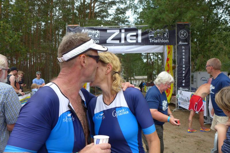 Mit der Wettkampfeinweisung stieg dann auch die Anspannung bei den Bode-Runners. Die meisten Jedermann-Veranstalter lassen ihre Teilnehmer 500 Meter schwimmen, doch in Wischer waren 750 Meter ausgeschrieben. Ein schlechtes Omen für die Gaensefurther Läufer, die allesamt hohen Respekt vor der Schwimmdisziplin haben und froh sind, wenn sie dem feuchten Element wieder entflohen sind. Einen Neoprenanzug benötigen die Bode-Runners im Übrigen nicht: „Meine Schutz- und Wärmeschicht ist echt!“, stellte Jens-Uwe Börner schmunzelnd fest! Los ging es und tatsächlich, was für ein „Staub“ am Wendepunkt der 750 Meter langen See-Runde! Triathlet André Geist wurde als Erster im Wechselgarten gesehen. Er gesellte sich nämlich kurzentschlossen zu den Jedermännern, verlief sein Drei-Kilometer-Testlauf am frühen Morgen doch besser als gedacht. Mit „Gute Fahrt“ verabschiedete das Schild eines bekannten Likörherstellers die Hobbysportler auf die 14,5 Kilometer kurze Radstrecke. Ruckzuck war die Runde von Wischer über Billberge, Storkau, Staffelde und Arnim gefahren, bevor die Runners endlich ihre Fünf-Kilometer-Distanz laufen konnten. Zufrieden klatschten die Sportfreunde ab. Mal was anderes als nur zu laufen! Gleich am folgenden Wochenende besteht in Havelberg die nächste Möglichkeit für einen Triathlon. Dort endet auch die altmark3cup Wertung, in der die Platzierten von Arendsee, Wischer und Havelberg in die Endauswertung gehen. Mit Renate Liedtke, Kirsten Geist sowie Jens-Uwe und Sabine Börner sind die Bode-Runners gut aufgestellt, bevor dann am 27. Juli alle Augen auf dem vereinsinternen 4. Salzlandsparkassen-Triathlon liegen.