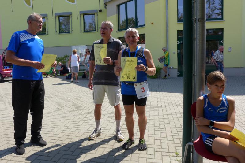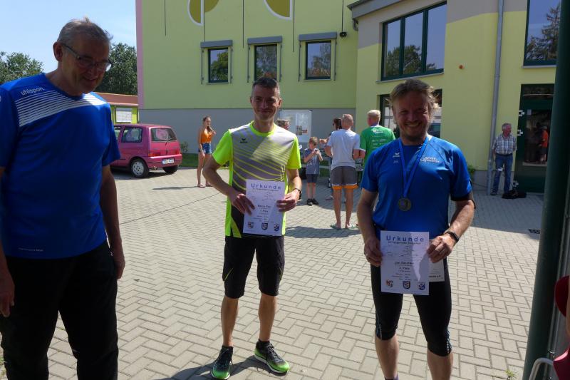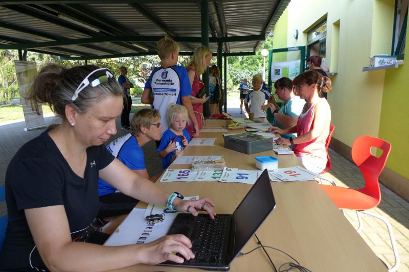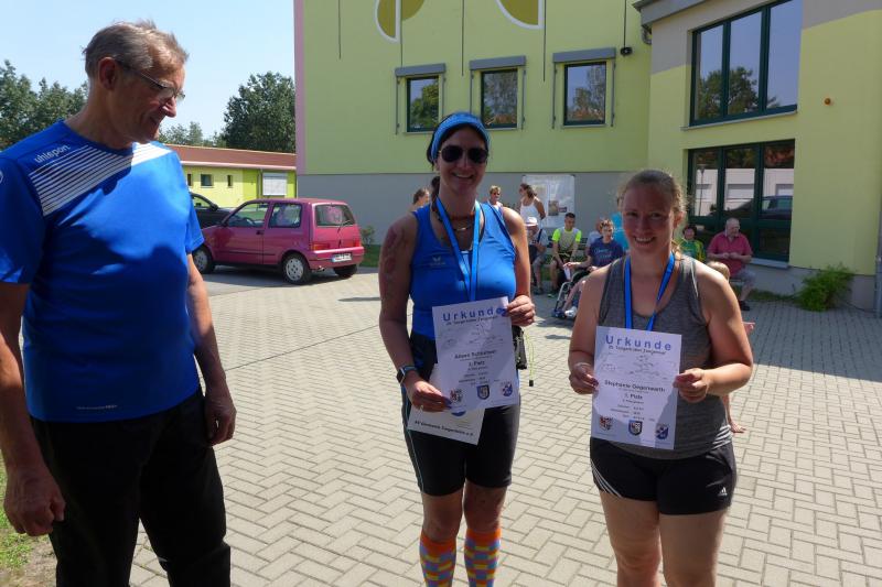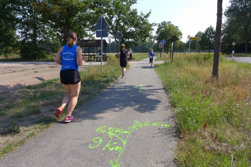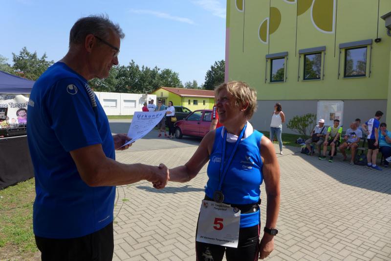 Während Kathleen Mahler und Börners nach dem Salzlandsparkassen-Triathlon vom Vortag nur auslaufen wollten, versprach Harald Fümel seiner Ehefrau Christa ein gemeinsames, ruhiges Sonntagsläufchen. Also ging der Auftrag, ein schnelles Rennen für die Bode-Runners abzuliefern, an Sandra Zelmer. Nach dem Radweg bis Briest führte die Laufstrecke durch den Tangerhütter Wald, in dem die Temperaturen etwas angenehmer waren. Die zusätzlichen Wasserstellen wurden gut angenommen und am Verpflegungspunkt der Tangerbrücke war dann auch schon die Wendemarke für den 6,5-Kilometer-Kurs erreicht. Zelmer musste noch weiter, bis ein Streckenposten den Wendepunkt der Neun-Kilometer-Strecke markierte. Die Sportlerin setzte den Auftrag sehr engagiert um und holte sich nach dem Zieldurchlauf prompt den Gesamtsieg bei den Frauen. Zeitgleich und eigentlich viel schneller als geplant, liefen Mahler und Börner auf Gesamtplatz 2 der Frauen ein. Während anlässlich der Jubiläumsausgabe noch einige Präsente an verdiente Sportfreunde des Tangerlaufs gingen, feierte auf Grund der geringen Teilnehmerzahl fast jeder Finisher einen Podestplatz. „Von wegen Auslaufen!“, scherzten und freuten sich die Sportfreunde unter der wohltuenden Dusche über ihre Platzierungen.