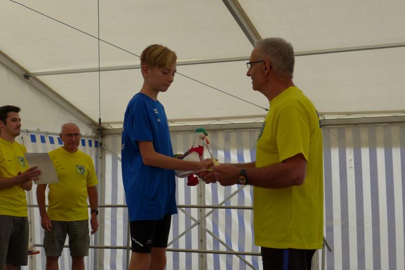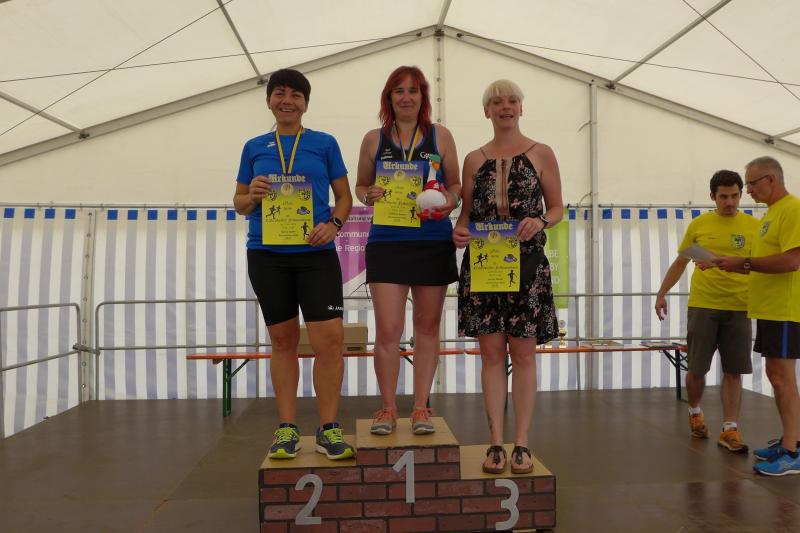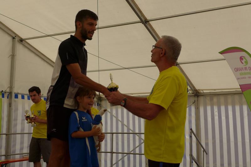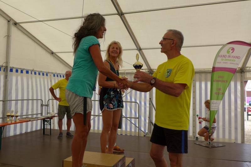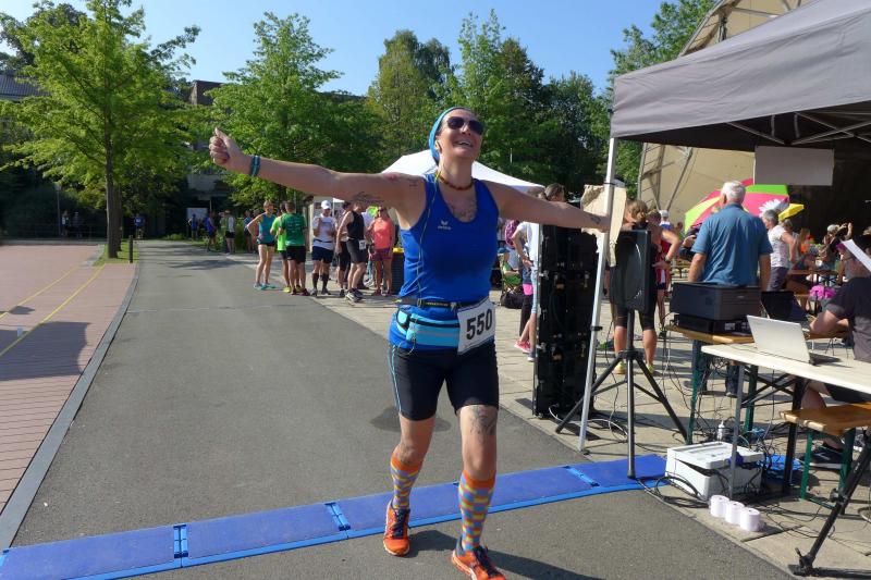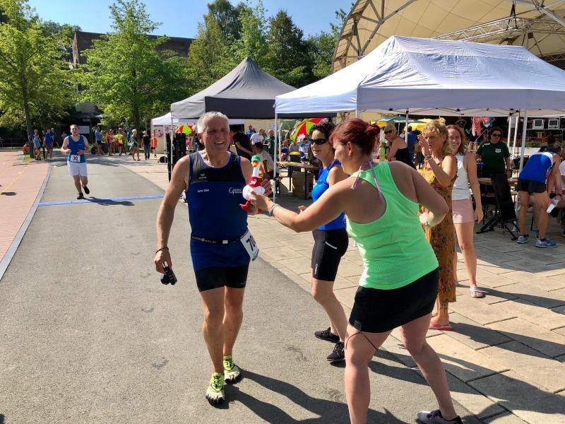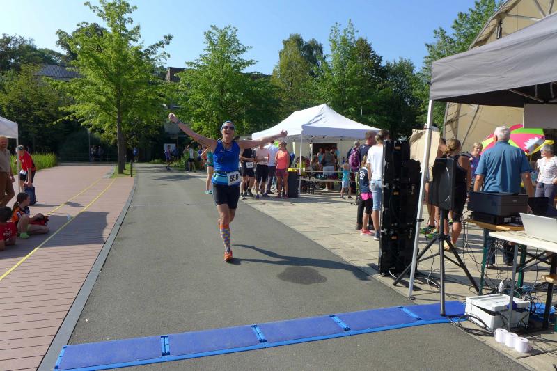 Ausgeruht und komplett auf ihre Heimstrecke konzentriert, finishte Petra Becker die Neun-Kilometer-Distanz auf Platz drei in ihrer Altersklasse W50. Sandra Zelmer lief nach einer kurzen Auszeit sogar auf Platz eins in der W30, gefolgt von Janine Wuwer (Platz zwei W35). Kathleen Mahler siegte in der W40 vor Nancy Bothe, die sich im Ziel wahnsinnig über ihre schnelle Zielzeit freute, und in der W50 standen auf dem Podest ausnahmslos Gaensefurther Füße. In der männlichen Jugend U14 lief Marc Krüger ein beherztes Rennen über lange neun Kilometer und brachte die Strecke noch unter 53 Minuten über die Ziellinie. Hautnah konnte er den Zieleinlauf der ersten Läufer über die 13-Kilometer-Distanz mitverfolgen. Scheinbar fliegend überholte Triathlet Maik Löwe, gefolgt von Neuzugang Rinaldo Schielke, der trotz abfallender Strecke und Rückenwind den Vorauseilenden nicht mehr einholen konnte. Keine Chance, schmunzelte Löwe im Ziel, ist er doch in der Form seines Lebens: „Barcelona wartet in vier Wochen auf mich und Ziel ist die Qualifikation für den Ironman Hawaii 2020!“
