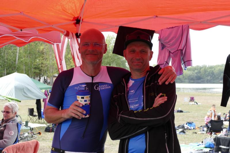 Für den kulinarischen Abschluss versuchte sich jeder noch etwas Zeit zu nehmen und man wertete die Ergebnisse aus. Das Damenteam mit Wille, Nowak und Ludßuweit schaffte es trotz viel besserer Zeit erstmals nicht auf das Podest, war aber trotzdem mit Platz 5 zufrieden. Bestes Männerteam aus Gaensefurther Sicht waren Berger, Moch und Sprechert mit Platz 22. Das beste Mixed Team aus dem Verein stellten Kirsten Geist(Bode Runners), Andre Geist und Paul Thüne ( Freund des Vereins!). Beste Einzel Sportler der Gaensefurther waren Mathias Lampe und Stefanie Nowak. Marco Hofer hatte eine super Laufzeit von 19:33min, Olaf Moch überzeugte mit einer guten Radzeit von 36:46min und Andreas Sprechert hatte mit 14:15min die beste Schwimmzeit aller Gaensefurther Teams. Super in Form zeigten sich auch unsere zwei ältesten Sportler Renate Liedtke (von den Bode Runners) und natürlich unser Jürgen Eisfeld in ihren jeweiligen Teams. Fantastisch!