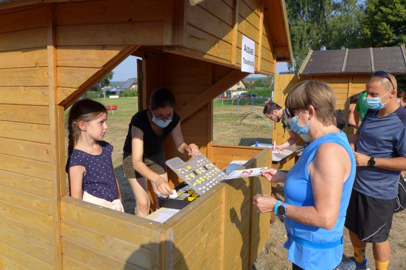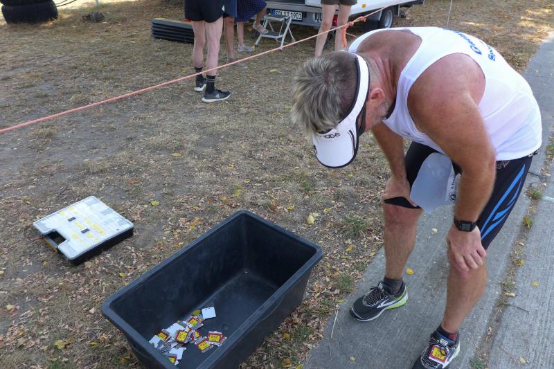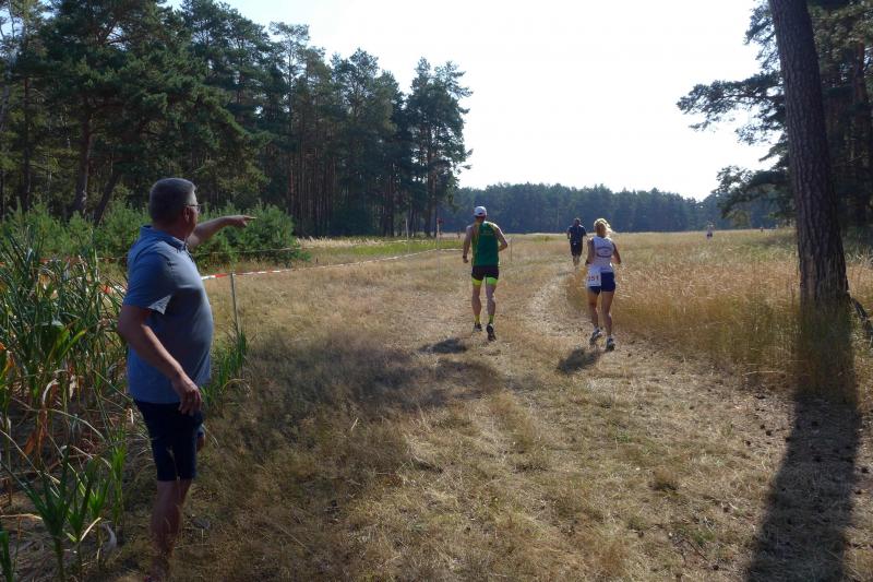 Was den Untergrund betraf, hatte die Strecke alles zu bieten und verdiente zweifelsohne das Prädikat „Cross“. Betonplatten führten über die erste Anhöhe, bevor eine Gabelung die Kurzstrecke über drei Kilometer bald von der Sechs-Kilometer-Distanz trennte. Auf weichen Waldwegen musste man lediglich den zahlreichen Kienäpfeln ausweichen. Ganz nach dem Geschmack für Barfußläufer, wechselten sich holprige Stoppelwiesen mit tiefen Sandwegen ab, bevor auch schon wieder eine weitere Anhöhe zu erklimmen war. Ehe es aus dem Wald hinaus auf eine Lichtung ging, versorgte ein Verpflegungsstand mit Getränken. Der Hinweis, die leeren Becher wieder in die bereitgestellten Abfallbehälter zu werfen, brachte manchen Läufer aus dem Tritt, denn oft verfehlte die Arm-Motorik das enge Ziel. Das muss vor den nächsten Wettkämpfen unbedingt geübt und weiter verinnerlicht werden! Die große Lichtung erlaubte eine Ausschau auf das Renngeschehen, machte Abstände sichtbar und offerierte eine weitere Anhöhe, die zu bewältigen war. Aber es ging dann auch mal bergab, bevor ein Streckenposten bei Kilometer 5,3 die letzte Steigung ankündigte. Die geschafft, ging es für alle Sechs-Kilometer-Läufer rasant bergab in das wohlverdiente Ziel.