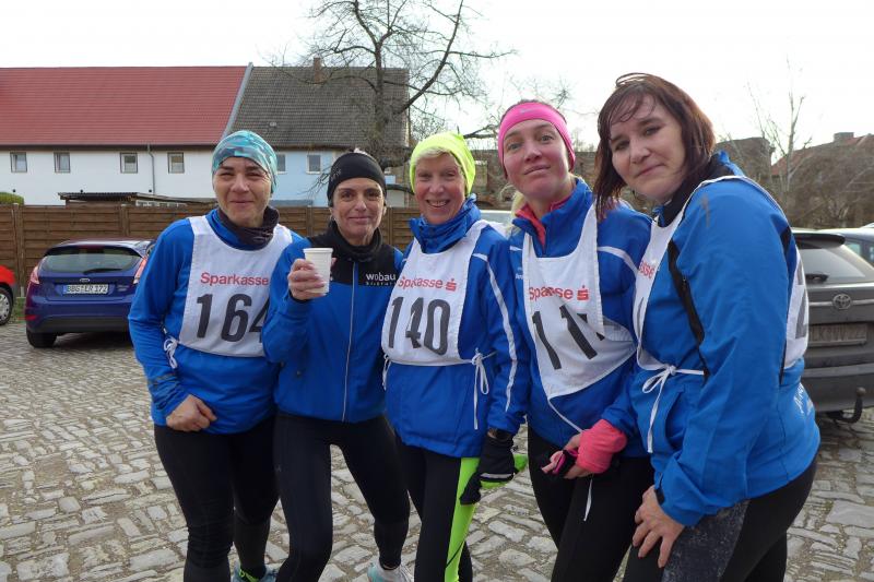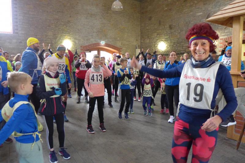 "Start um Zehn, elf Uhr Siegerehrung, ab 13 Uhr Regen!", so konnten die Bode-Runners den groben Fahrplan aus dem Chat der Trainingsgruppe entnehmen. Bis Mittag war also gutes Wetter angesagt, worauf sich auch zahlreiche Läufer und Walker zum Neujahrslauf in Aderstedt einfanden. Die Wiedersehensfreude war groß, denn nicht alle hatte man vorige Woche bereits beim Punschlauf gesehen. Die Höhe der Startgebühr konnte sich jeder Teilnehmer selbst überlegen und in der bereitgestellten Spendenbox entrichten: „Wir brauchen neue Startnummern!“, galt der Ansporn für eine hohe Summe. Dabei befanden die meisten Starter doch gerade die urigen Nummern aus Stoff, die als Leibchen um den Oberkörper gebunden wurden, als sehr originell. Im strahlenden Sonnenschein hielten die Vereine oder teilnehmenden Familienmitglieder ihre ersten Gruppenbilder für die Nachwelt fest. Die junge Hündin Paula, die zum ersten Mal mit den Bode-Runners der Gaensefurther Sportbewegung auf Reise ging, hielt mit Frauchen Renate noch respektablen Abstand zur Gruppe. Bei der Erwärmung in der großen Festscheune warteten die beiden lieber brav vor der Tür.