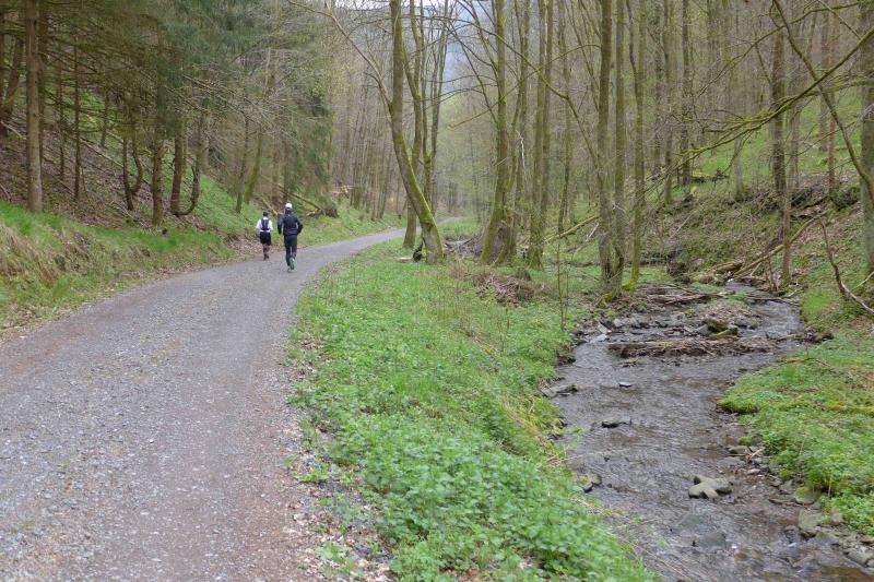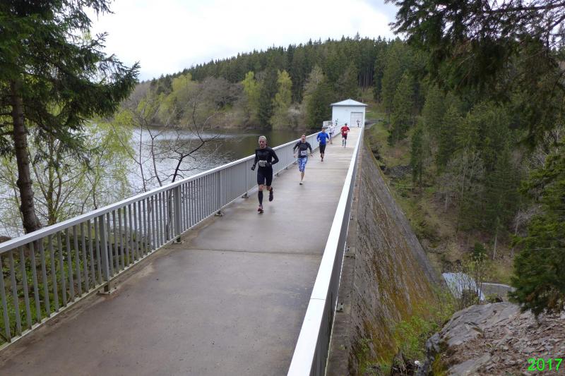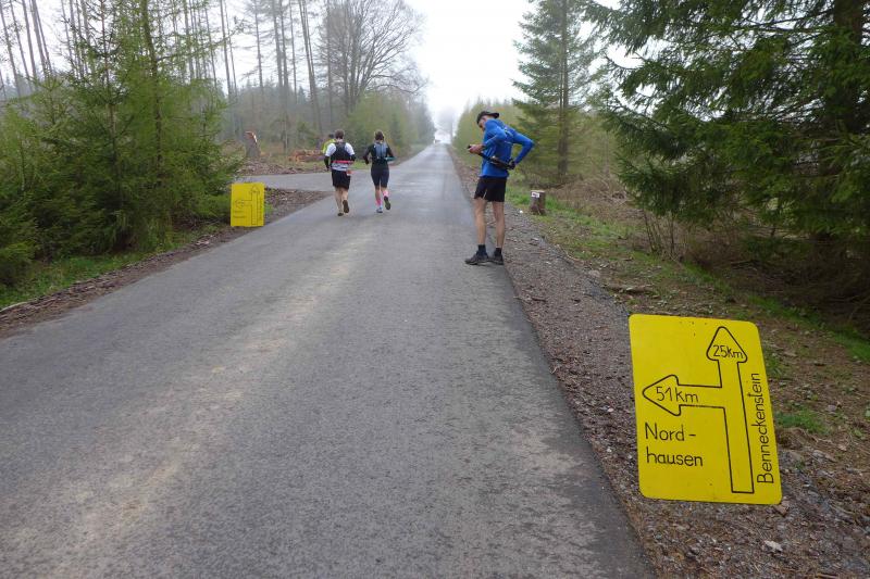 Einen Tag später waren dann die Langstreckenläufer der Gaensefurther Sportbewegung gefordert, denn die 42. Harzquerung stand auf dem Plan. Jens-Uwe Börner hatte für weite 51 Kilometer gemeldet. Petra Becker und Detlef Schäfer standen mit ihm gemeinsam am Start in Wernigerode, waren aber nicht ganz so verrückt und „nur“ auf 25 Kilometer aus. Durch den schlechten Zustand der Wege mussten sich aber alle Teilnehmer auf Umleitungen und damit längere Strecken einstellen. Gleich zu Beginn ging es heftig bergauf und riesige Matschpfützen sorgten für nasse Schuhe. Schlechte Voraussetzungen für eine Langdistanz, begünstigt Feuchtigkeit doch oft eine Blasenbildung. Ein Überholen war schwierig, denn die lange Läuferkette schob sich schleppend die schmalen Steigungen hinauf. Zeit, den Blick schweifen zu lassen, der anstatt auf dichte Wälder oft über weit gerodete Flächen im Horizont verschwand. „Hier war doch vor 6 Jahren noch Wald!“, schüttelte Börner in Erinnerung an seine letzte Harzquerung traurig den Kopf und registrierte stattdessen den Geruch der riesigen Holzstapel frisch geschlagener Bäume am Wegesrand. Aber nicht nur das frustrierte. Auch sein Zeitplan geriet komplett aus den Fugen, denn die Ankunftszeit der Harzbahn, die er sich auf den Unterarm geschrieben hatte, war schon längst verstrichen. Um sie am Kreuzungspunkt fotogarfisch festhalten zu können, hätte er schon fünf Kilometer weiter sein müssen. Der 25-er Kurs mit Becker und Schäfer war bereits abgebogen und in Richtung Ziel unterwegs, als dann auch Sabine Börner ab Benneckenstein die 30 Kilometer lange Wanderstrecke in Angriff nahm. Abenteuerlich führte sie auch durch Bachläufe, Seile halfen an steilen Passagen hinunter oder hinauf und immer wieder galt es Platz zu machen, wenn sich die schnelleren Läufer von hinten laut bemerkbar machten: "Links! Ich komme von rechts!" Auf das Überholen des Gatten wartete sie allerdings vergebens, denn zu allem Unglück verpasste er den richtigen Abzweig. Diesen Irrtum bemerke er erst nach zwei Kilometern, da es keine Markierungen und Streckenposten mehr gab. Bis zum Abzweig nochmal zwei Kilometer zurück und Läufer überholen, die man ja schon mal einkassiert hatte - Börners Laune war verständlicher Weise auf dem Tiefpunkt.