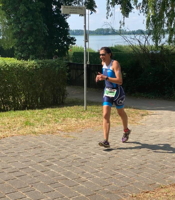 Es waren immer noch Athleten der Halbdistanz auf der Laufstecke, als es dann auch endlich für die aufgeregten Bode-Runners losging. Im Vorfeld gab es heiße Diskussionen über das zugelassene Equipment bei den Disziplinen. Da wurde dann schon mal das Regelwerk der Deutschen Triathlon Union in ihrer aktuellen Wettkampffassung heruntergeladen und interpretiert. Schnorchel und Schwimmschuhe durften demnach nicht mit, stattdessen mussten irgendwie noch diese Rohrenden am Lenker verschlossen werden! Geschafft, alle sechs Räder der Gaensefurther bestanden den Check-in und durften im großen Wechselgarten, mitten auf dem Marktplatz von Arendsee, Platz nehmen. Nun ging es mit dem Schaufelraddampfer „Queen Arendsee“ hinaus auf den aalglatten See. Der Puls schlug bis zum Hals, denn als die Queen stoppte, mussten über 150 Jedermänner möglichst schnell den Sprung vom Dampfer in das kalte Wasser wagen. Eine gelbe Boje markierte die Wasserstartlinie, schnell nochmal das Ziel am Ufer anvisiert, bevor von der Queen Arendsee lautstark das Startsignal ertönte. Als Brustschwimmer hatte man alles gut im Blick, viele versuchten sich auch im Kraulstil, keine Rede mehr von einem aalglatten See. Stefan Sindermann berichtete sogar von Rückenschwimmeinlagen, Hauptsache sich mit dieser unbeliebten und ungewöhnlichen Betätigung an das Ufer retten! Von den zahlreichen Zuschauern wurden die pudelnassen Schwimmer mit Applaus begrüßt. Der war auch dringend nötig, ging es doch an der Kaskade ziemlich krass den Berg hoch, über die Amtsfreiheit und Hohe Warthe zur Friedensstraße, einen halben Kilometer bis zum Wechselgarten auf dem Marktplatz. Gut, wer sich den Standort seines Rennrades vorher eingeprägt hatte. Schuhe an, Helm auf und ab auf die zwei Runden vom Marktplatz, über die Feld- und Bahnhofsstraße, zur B 190 nach Leppin. Hier lieferte sich Heike Lenz mehrfach ein Kopf-an-Kopf-Rennen mit dem starken Geschlecht. Da auch beim Radfahren strenge Regeln gelten und sich die Eingeholte immer wieder zurückfallen lassen musste, um Zeitstrafen wegen Windschattenfahrens zu vermeiden, folgte Antritt um Antritt, bis sich die Konkurrenten endlich geschlagen gaben. Die Debütanten Wuwer und Bothe ließen beim Schwimmen und auf der Radstrecke viele Körner. „Nie wieder!“, taten sich Gedanken auf, während Peter Brauer, Heike Lenz und Stefan Sindermann auf den abschließenden fünf Kilometern noch einige Jedermänner einkassieren konnten. Zwei Stunden Sportspaß sollten vergehen, bis alle Bode-Runners im Ziel wieder vereint waren. „Was für ein geiler Scheiß!“, waren sich alle einig und feierten den verdienten ersten Platz von Heike Lenz in der Wertungsklasse Seniorinnen 4. Vielleicht genug Ansporn um in die altmark3cup-Wertung der Jedermänner zu kommen und die Wettkämpfe in Wischer (09.07.2023) und Havelberg (03.06.2023) anzuschließen. Für einige Bode-Runners wird auf jeden Fall der vereinsinterne 5. Salzlandsparkassen-Triathlon am 26.08.2023 rund um den Löderburger See ein Pflichtprogramm sein.