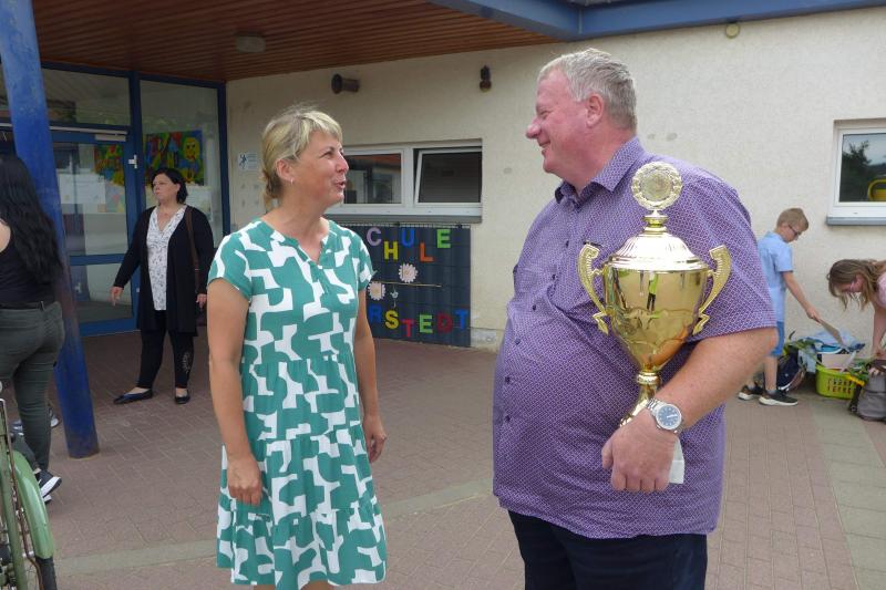 Aufregender konnte das Schuljahr für die Mädchen und Jungen der Förderstedter Grundschule nicht zu Ende gehen. Pünktlich zum Zeugnistag wurde ihnen mit großem Bahnhof die glänzende Siegertrophäe des Stadt-Pokal-Laufs durch Bürgermeister René Zok überreicht. Der Stadt-Pokal-Lauf der Grundschulen fand im Rahmen des 5. Staßfurter Salzland-Laufs am 2. Juni statt.