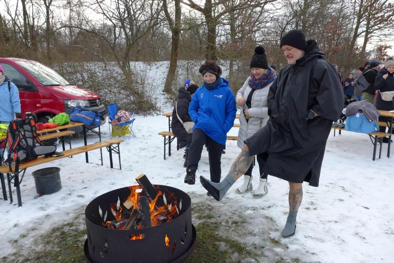 Vorsichtig, zum Teil barfuß, ging es den verschneiten Hang zum Ufer hinunter, bevor der große Zeh die Wassertemperatur prüfte. "Na zwei Grad sind es bestimmt!", stellten die Eisfüße erleichtert fest. Die freigelegte Badestelle war schnell ausgefüllt, so dass es nur in kleinen Gruppen in den Schachtsee ging. Mit 20 bis 25 Eisbadern hätte Rottstegge schon gerechnet: „Bei 40 haben wir aufgehört zu zählen!“, meinten die begeisterten Helfer, die nicht mit so vielen Teilnehmern gerechnet hätten. War für die Debütanten ein kurzes Eintauchen vollkommen ausreichend, hielten es die Profis schon einige Minuten im Eiswasser aus. Durchgezogen und eine echte Eisscholle in den Händen - das zauberte an diesem Tag ein stolzes Lächeln in viele Gesichter. Und entgegen den sonstigen Eisbadeterminen, an denen man den Elementen ausgesetzt ist, war das Anziehen im extra aufgebauten Wärmezelt blanker Luxus. Warme Getränke und eine leckere Bratwurst, die Bode-Runner-Eisfüße kommen im nächsten Jahr gerne wieder.