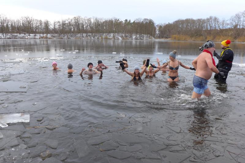Das kalte Wetter hätte an diesem Tag nicht besser sein können, denn der See war in Ufernähe mit einer zwei Zentimeter dicken Eisschicht bedeckt. Ein Rettungsschwimmer, der in einem dicken Neoprenanzug steckte, hatte gut zu tun, für die Eisbader eine kleine Badestelle freizulegen. Inzwischen füllte sich das Gelände mit reichlich Zuschauern, zwischen denen wohl so einige Eisbader stecken mussten. Nach und nach outeten sich die Mutigen durch ihre lustigen Badetextilien, oder Badeschuhe, sogar Styroporplatten gegen die Bodenkälte kamen zum Einsatz. Jeder hatte seine eigene Taktik, sich auf die eisigen Sekunden oder Minütchen im kalten Eiswasser vorzubereiten. Nach einer kleinen Ansprache auch mit dem Appell es bitte nicht zu übertreiben, erfolgte eine Erwärmung bei flotter Musik. Oberstes Gebot beim Eisbaden ist nämlich, nicht kalt in das Wasser zu gehen.