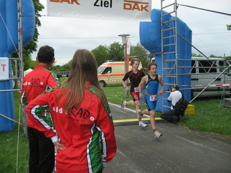 Für den Triathlon der Kinder und Jugendlichen wurde das Schwimmen vorsichtshalber abgesagt. So gab es nur einen Duathlon über 800 Meter Laufen, 4,9 Kilometer Radfahren und dann noch einmal 800 Meter Lauf. Martin Wille (m15) schlug sich beim Laufen zunächst sehr gut und konnte an der Spitze des Feldes auf die Radrunde gehen. Leider wurde er als Spitzenfahrer beim Wendepunkt durch den Streckenposten nicht richtig gelenkt, so verlor er wichtige Zeit und kam erst als Fünfter und mit viel Wut im Bauch zum abschließenden Lauf. In der Altersklasse reicht es dennoch zum Sieg, aber eigentlich hätte er ja auch Gesamtsieger werden können. Das wurmte natürlich.