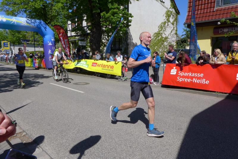 Trotz der Vielzahl an Möglichkeiten, waren alle Veranstaltungen gut besucht. Im Spreewald herrschte sogar an vier Tagen Ausnahmezustand, denn dort waren über 13.000 Aktive als Läufer, Walker, Wanderer, Skater, Paddeler oder Fahrradfahrer unterwegs. Für eine "goldene Gurke" mussten da schon Tagestouren von 200 Kilometer gefahren oder ein Marathon absolviert werden. Erstmalig gab es zum Nachtlauf in Lübbenau eine blaue Gurke nach dem Zieleinlauf. Eindrücke von Läufern mit Lichterketten, Fackeln am Wegesrand und bunt angestrahlten Bäumen und Fassaden werden wohl eine Weile in Erinnerung bleiben. Bis in die Morgenstunden konnte auf dem Marktplatz noch das Tanzbein geschwungen werden. Nicht für die Bode-Runners, die in der Frühe schon wieder für Rad- oder Paddeltouren gemeldet hatten. Wer diesmal im Spreewälder Burg auf nächtliche fünf Kilometer gehen wollte, der hatte erneut ohne Zeitmessung Spaß beim Laufen oder Walken. Der Sonntag stand dann ganz im Focus der Tempomacher. Beim Massenstart über die Zehn-, Halb- und Marathondistanzen sortierten sich am Ende auch noch Walker und Wanderer ein. Der ganze Spreewald war quasi in Bewegung. Nach und nach klatschen sich die einlaufenden Bode-Runners ab, um dann vereint die beiden Gaensefurther über die Königsdisziplin in Empfang zu nehmen. Mario Kreutzmann hatte in Vorbereitung auf den Marathon ja eigentlich von der Schnapszahl 3:33 Stunden geträumt. Doch mit Übergabe seiner Startnummer "340" war sein Ziel schnell fest gemacht: "Unter 3:40 Stunden wäre doch eine gute Marathonzeit!" Und dann war da noch Lina Epperlein, mit der Kreutzmann bis zur halben Distanz gemeinsame Sache machte. Ab da eröffnete sich für die Debütantin komplettes Neuland und sie wagte die Flucht nach vorne. Eine App hielt die Wartenden aktuell und ziemlich bald war klar, dass es nicht nur eine super Zeit werden würde. Die 19-jährige Epperlein lief nach 3:28:45 Stunden als zweite Frau über die Marathondistanz beim 23. Spreewald-Marathon ein. Nicht lange, dann landete auch Kreutzmann mit einer Zielzeit von 3:37:50 Stunden genau in seinem Traumfenster. Freudetränen und Endorphine sprudelten, was seine Blasen an den Füßen gleich ein wenig erträglicher machte. Die Siegerehrung der Marathonläufer auf der großen Festbühne, nahm kein geringerer als Sport-Adi persönlich vor. Ein Moment, der einigen feuchte Augen bereitete und an „Mach mit, mach’s nach, mach’s besser“ Zeiten erinnerte. Seit Jahren begleitet der Jungbrunnen den Spreewaldmarathon: „Grüßt mir die Renate!“, gab er den Bode-Runners mit auf den Weg, der sich an das Sportfest der Grundschulen in der neuen Salzland-Sporthalle noch gut erinnern konnte.