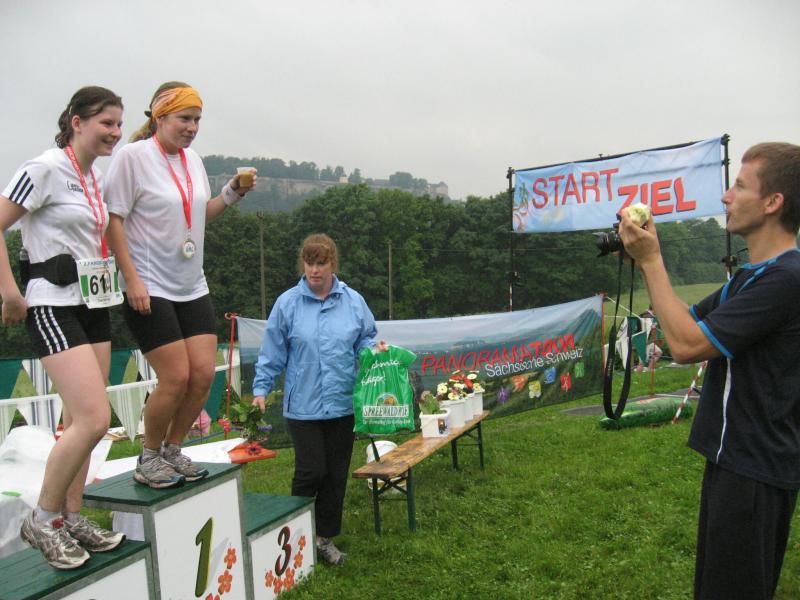 Die zweite Auflage des Panoramalaufs durch die Sächsische Schweiz, der am Sonntag durchgeführt wurde, nahmen Jens-Uwe und Sabine Börner (Gaensefurther Sportbewegung) sowie Tochter Tina (Hamburg) in Angriff. Bei idealem Wetter waren auf einer waldreichen 30 Kilometer langen Strecke entlang der Elbe 490 Höhenmeter zu überwinden. Jens-Uwe Börner (Altersklasse M 45/4.) benötigte dafür 2:33:52 Stunden. Gemeinsam ins Ziel liefen (v.l.) Sabine (Ak W 40/4.) und Tina (Ak W20/2.) nach 3:27:55 Stunden.