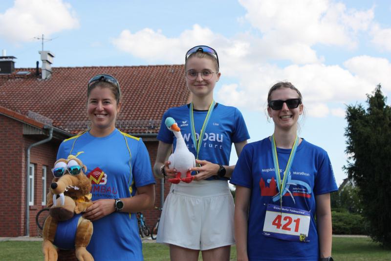 Nach Platz zwei für Kroner in ihrer Altersklasse W30, stand am nächsten Tag der Eickendorfer Feldmarklauf im vollgepackten Laufkalender: „Was mache ich hier?“, kam nach ihrem Bodycheck fragend über ihre Lippen. Doch nach der Erwärmungsrunde und einem gemeinsamen Lauf mit Rieke Zaschke über schlappe sieben Kilometer durch die Eickendorfer Feldflur, waren die Extremitäten wieder recht leichtfüßig - Platz eins in ihren Altersklassen! Auch Janine Wuwer und Nadine Rudolph schenkten sich nichts und versuchten immer wieder sich gegenseitig zu puschen. Die Rennerei bescherte beiden einen zweiten Platz, über den sie sich am Ende sehr freuten. Für Christa und Harald Fümel lief es ebenfalls wieder ganz nach Plan, auch wenn die Sonne die Schweißperlen nur so laufen ließ. Kathleen Auer und Nicole Zaschke fanden ihr Tempo und freuten sich am Ende über einen dritten Platz und auch Daniel Bierbach war mit seiner Laufzeit mal wieder zufrieden. Über den langen Kanten hatte die Jugend die Nase vorn. Bravourös sicherte sich Lina Epperlein den Gesamtsieg über 13 Kilometer. Auch schnellster männlicher Starter bei den Bode-Runners, Mario Kreutzmann, hatte keine Chance an Epperlein dranzubleiben. Dennoch sicherte seine Zeit Platz eins in der M50 und volle Punktzahl als Wertungslauf der Solvay-Cup-Serie. Dort sieht es auch für Marc Krüger sehr gut aus. Der junge Läufer der Altersklasse männliche Jugend unter 20 Jahre wagte sich an die 13 Kilometer und brauchte dafür nur eine Stunde. Dass man die auch gut walken kann, bewies mit Platz zwei in der W45 eine glückliche Kathleen Mahler. Der Solvay-Cup macht eine kurze Pause – am Sonntag geht es mit dem 5. Othaler Gutshoflauf im Novo-Nordisk Läufercup wieder auf Punktejagt.