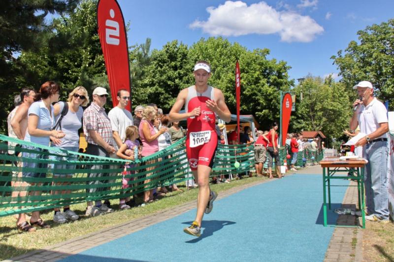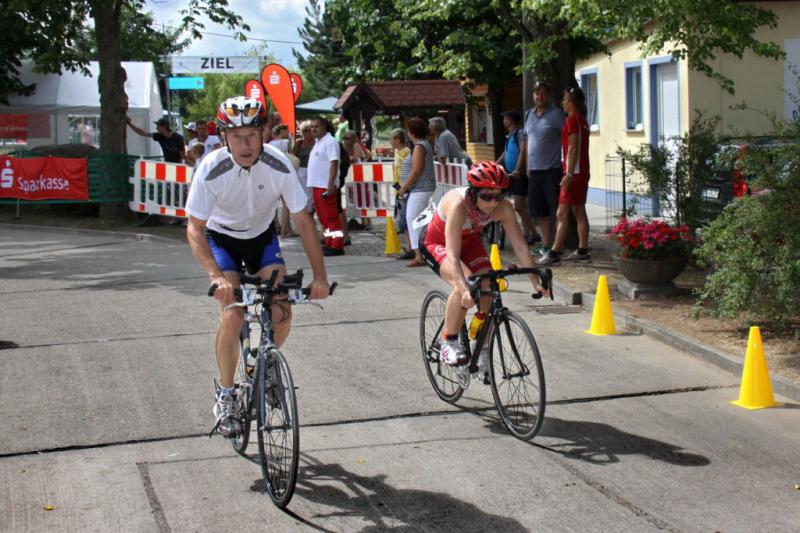 Im Ziel gab es dann eine faustdicke Überraschung. Als die Zuschauer und Organisatoren mit dem nahenden Einlauf des lange Zeit führenden Christian Gramm (Magdeburger TC) rechneten und selbst vom irritierten Wettkampfsprecher darauf vorbereitet wurden, überquerte der Leipziger Olaf Ueberschär als Erster die Linie. Mit dem angehenden Doktor der Physik hatte also ein Teilnehmer des Jedermann-Wettbewerbs die Gesamtwertung für sich entschieden. Gramm, der eine neuerlich starke Leistung auf dem Rad zeigte und ebenso gewohnt auf der Laufstrecke an Tempo verlor, siegte in der Lizenzwertung.