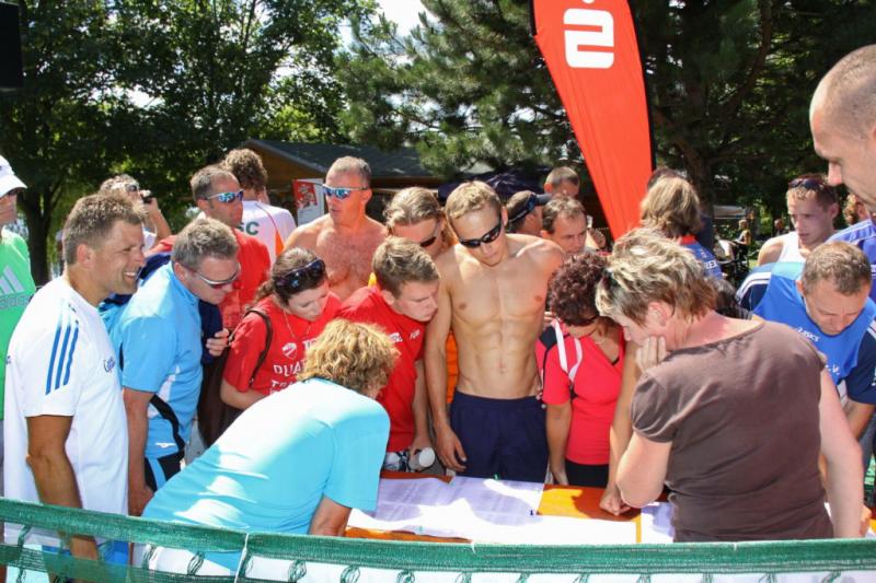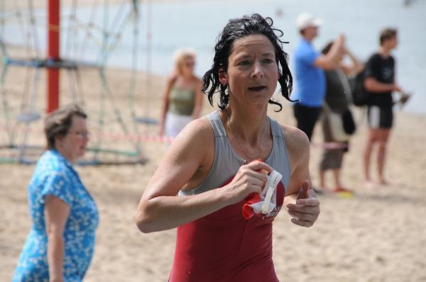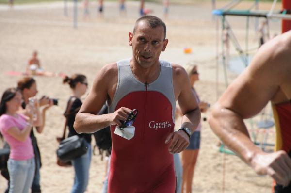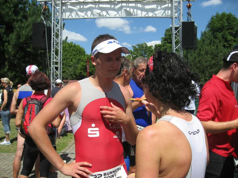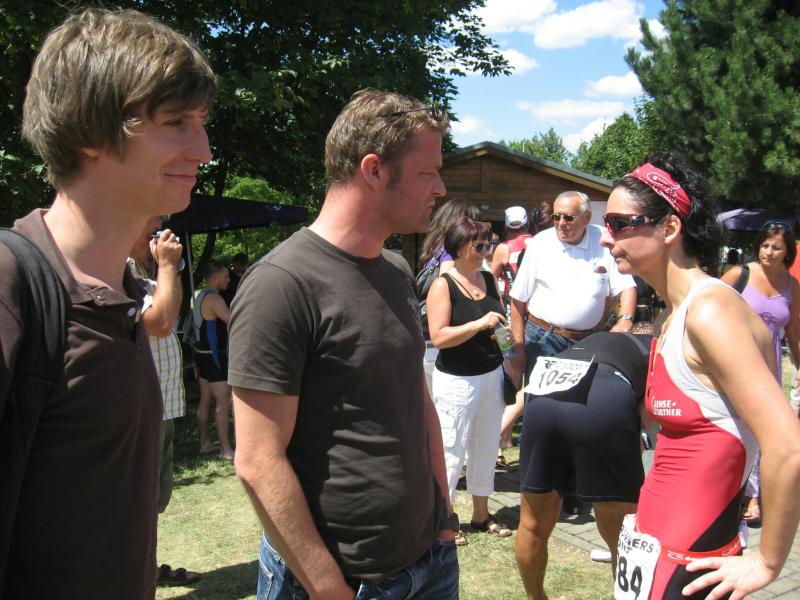 Auch ohne die wasserabweisenden und auftriebsfördenden Hilfsmittel legten die Athleten einen imposanten Start ins Wasser hin. Die sonst ruhige Oberfläche des Sees verwandelte sich für Minuten in ein sprudelndes Becken. "Ein einziges Hauen und Stechen", wie Steffen Schöler später befand. Der Abteilungsleiter der Sportbewegung war sichtlich froh, diese Tortur unbeschadet überstanden zu haben. Als Neunter in seiner Altersklasse Senioren 1 (Lizenzwertung) erreichte er in 1:37:41 Stunden das Ziel. + Detlef Schäfer. Vom Wasser aus ging es am Strand entlang eine kurze, aber schmerzvolle Steigung hinauf zum Wechselgarten. Hier gewannen die Zuschauer an der Strecke einen ersten Eindruck vom Fitnesszustand der Athleten. Einen weniger guten mussten sie bei Florian Börner zur Kenntnis nehmen. Nach vier Monaten Wettkampf- und Trainingspause – zwei Operationen und Abiturstress inklusive – hörte der 18-Jährige früh die negativen Signale seines Körpers. "Schon im Wasser habe ich gemerkt, dass das heute nichts wird", zeigte sich Börner enttäuscht. Die anschließenden 30 Kilometer auf dem Rad nutzte der Grundwehrdienstleistende als Trainingseinheit. Seine Teamgefährten wussten Börners Anstrengungen im Ziel neckisch zu würdigen: "Sag mal Florian, hattest du ‘ne Panne?"