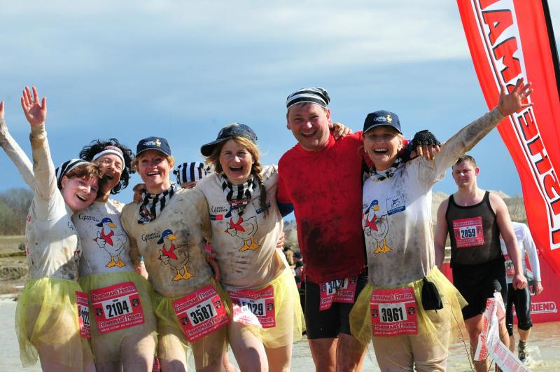 Da man zunächst kaum Luft bekam, wurde es ganz leise und dann ab die 20 Meter durchs kühle Nass. Geschafft! Die Sachen trockneten super schnell. Zum Glück schaute auch die Sonne ab und zu mal raus. Aber getrockneter Schlamm auf der Haut hat ja auch was Aufregendes. Kalt wurde einem nach den Wasserlöchern nie, denn dann musste man sich schon wieder Gedanken machen, wie man über sechs Meter hohe Hindernisse kam, danach auf Netzen wieder abstieg, dann Autoreifen überwindet, wieder Netze und dann eine feuchtfröhlich Rutschpartie wieder hinab. Außer der Gänsecrew, die natürlich wieder von einem einheimischen Sponsor unterstützt wurde, waren auch pinkfarbene Osterhasen, Schneewittchen mit ihren sieben Zwergen oder Schotten unterwegs.