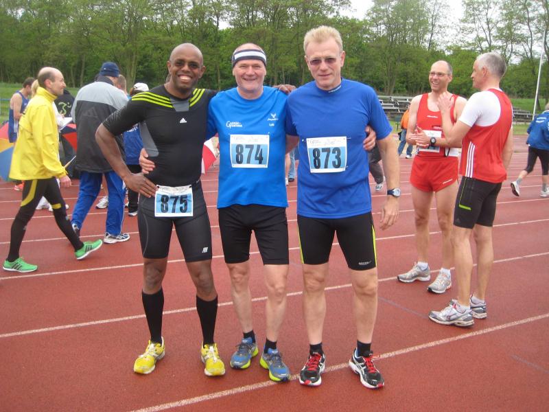 Annett Lampe(w40) erreichte bei ihrem Debütlauf („ bei ihrer ersten richtig anspruchsvollen Laufveranstaltung“) nach Babypause auf Anhieb auch wieder Platz 3 und ließ an alte sehr gute Zeiten erinnern. Allerdings hat auch sie sich dem Triathlon verschrieben wie auch ihr Mann Matthias Lampe. Er tat es seiner Frau gleich und schaffte auch den Sprung auf das Podest. In der Altersklasse m40 erkämpfte er sich unter den Laufspezialisten Platz drei. Die Männer mussten 25 Runden laufen. Aber auch hier ließen die grauen Wolken ihre nasse Last nicht fallen und so mussten auch die Männer nur mit den Pfützen auf der Bahn kämpfen.
