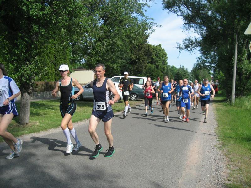Als anspruchsvoll und für „Fortgeschrittene“ deklariert, sollte die Strecke ihrer Beschreibung durchaus gerecht werden. Bereits nach dem ersten Kilometer stieg die Asphaltstraße merklich an. Doch gerade als das Atmen zu anstrengend werden sollte, sorgte ein schattiger Waldweg wieder für Entspannung. Das Spiel zwischen Licht und Schatten erforderte die ganze Aufmerksamkeit der Läufer. Hatten die Veranstalter den quer liegenden Baum als Extra-Bonbon auf dem Weg drapiert? Wie bei der „stillen Post“ wurde vom Vordermann lauthals an den Verfolger weitergegeben: „Baum!“ Gehüpft, gegrätscht oder draufgetreten, die Barriere sollte für die Läufer kein Hindernis sein. Aus dem Wäldchen führte die Strecke hinaus auf die Felder. Bis zur Streckenteilung brannte die Sonne zusätzlich auf die erhitzten Köpfe. Streckenposten teilten nun die ankommenden Läufer auf: „Die Sieben Kilometer nach links, elf Kilometer nach rechts!“ „Machs gut, arme Bine“, verabschiedete sich Petra Becker von ihrer Vereinskollegin. Zusammen mit Heidi Schwenke vom BSV Eickendorf flitzte Becker nun in Richtung Konradsburg. Die Wahl der kürzeren Streckenlänge sollte sich am Ende gelohnt haben, denn beide Läuferinnen konnten in ihren Altersklassen auf das Siegertreppchen steigen.