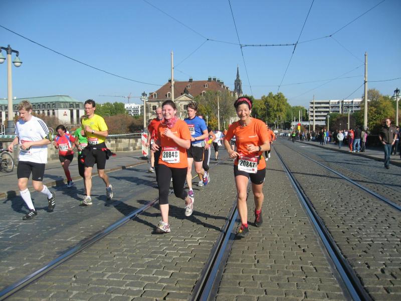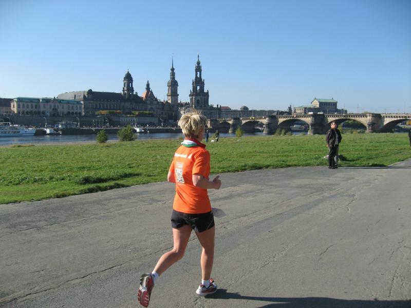 Bereits zum dritten Mal in Folge, ermöglichte die Firma Piepenbrock Service GmbH, teilnehmenden Bode-Runners der Gaensefurther Sportbewegung, einen Freistart für den 14. Dresden Marathon. Das ist angesichts hoher Startgebühren über die Langdistanzen eine Einladung, welcher ein Läufer schlecht widerstehen kann. So starteten also nach geglücktem Fotoshooting vor dem Congress-Center, 115 einheitlich orange gekleidete Piepenbrock-Läufer über die verschieden ausgeschriebenen Streckenlängen. Die „Stadtführung“ durch Dresdens berühmte Silhouette genossen an diesem wohl wärmsten Oktobersonntag insgesamt 7583 Finisher. Als kreuzungsfrei und mit nur neun Metern Höhendifferenz beschrieben, gilt der Kurs über die Halbmarathondistanz als sehr schnell. Für die sieben gestarteten Bode-Runners ein letzter Check auf den Frankfurt-Marathon am kommenden Wochenende! Vor dem Start jedoch ein letzter Tipp vom Trainer: „Geht hier in Dresden nicht im Maximaltempo auf die Strecke! Einen Muskelkater können wir jetzt nicht mehr gebrauchen!“ Bei mehr als 95 % Asphalt, versprach auch der Untergrund die gleichen Bedingungen wie in Frankfurt zu bieten. Ein Unterschied versteht sich jedoch auf das Stadtbild, welches mit all den Dresdner Sehenswürdigkeiten seines gleichen sucht. Von Cheerleadern, unzähligen Zuschauern und zahlreichen Musikbands begleitet, wurde nicht nur der größte Park Dresdens durchlaufen. Auch das Residenzschloss, die Kathedrale nebst Zwinger und Semperoper oder das imposante Gebäude der Gläsernen Manufaktur schwanden an den Sportlern vorbei. Nach dem Elbradweg mit dem Königsufer erreichten die Läufer ein letztes Mal die Augustusbrücke.