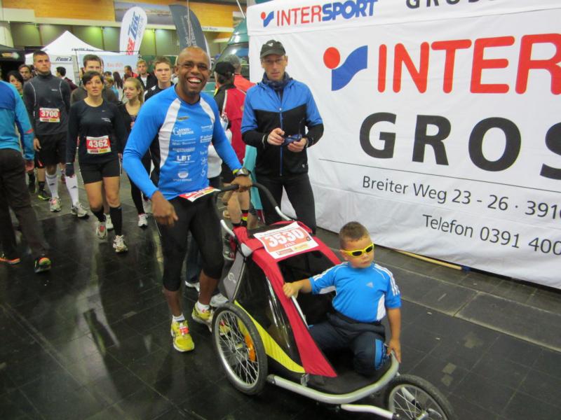 Beim 9. Magdeburg-Marathon starteten Annett und Matthias Lampe zusammen mit Sohn Finn im Beiwagen über die 13-Kilometer-Strecke. Für den Sprößling war es bereits die fünfte Teilnahme. Hatte er bei den ersten Läufen wenig mitbekommen, feuerte er diesmal seine Mutter an. "Mein Mann hat den Wagen geschoben und das Tempo vorgelegt. Wir wollten unter einer Stunde bleiben, es war anstrengend", so Annett Lampe.