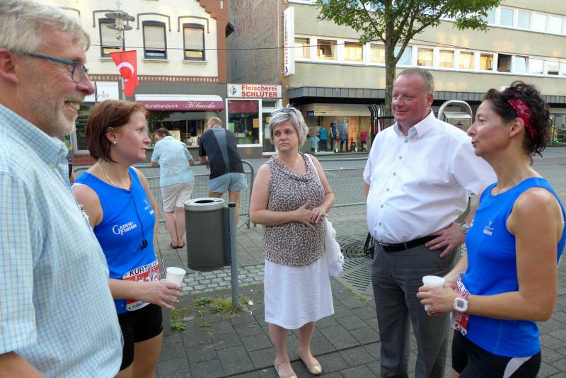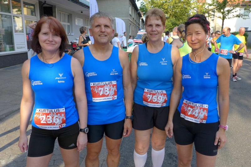 Beim Start des Hauptlaufes über fünf Runden konnte man dann schon vom „Abend“-City-Lauf sprechen. Die heiße Luft stand in den Straßen, aber die tiefere Sonne legte die Häuserfronten bereits in längere Schattenabschnitte. Jens-Uwe und Sabine Börner hatten den schnellen Rundkurs noch in guter Erinnerung, für Sylvia Köhn war es die erste Teilnahme beim Lehrter Citylauf. Auf der gesamten Strecke herrschte Volksfeststimmung. Aufgestellte Rasensprenger sorgten für Abkühlung, bei Bedarf bestand auch die Möglichkeit sich mit einer Ladung aus dem Wasserschlauch anspritzen zu lassen. Runde für Runde spulten die Bode-Runners ihre Kilometer ab, an jedem Getränkestand wurde zusätzlich Wasser getankt. Angefeuert von den vielen Zuschauern musste der Zielbogen vier Mal durchlaufen werden, bevor er endlich ein letztes Mal auf der Zielgeraden zu deuten war. Geschafft! Jens-Uwe Börner erlief von 63 Startern in der Altersklasse M50 einen zweiten Platz! Gewinner waren am Ende alle, denn wer es bei diesem 13. Lehrter Abend-City-Lauf ins Ziel geschafft hatte, erlebte seine ganz eigene Laufgeschichte. Zufrieden über das Geschaffte und über eine meistergültig organisierte Veranstaltung, ging für die Gaensefurther kurz vor Mitternacht die Reise wieder in Richtung Sachsen-Anhalt.