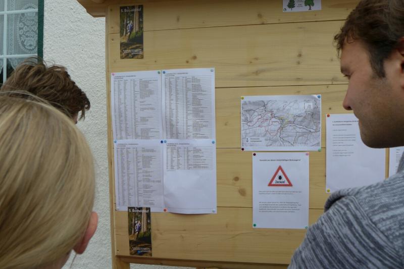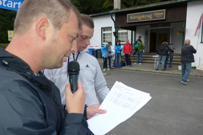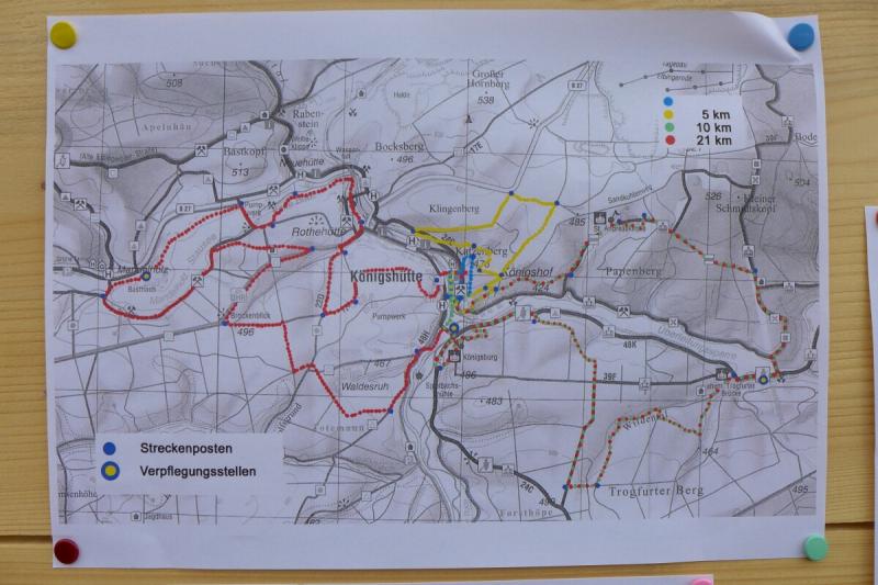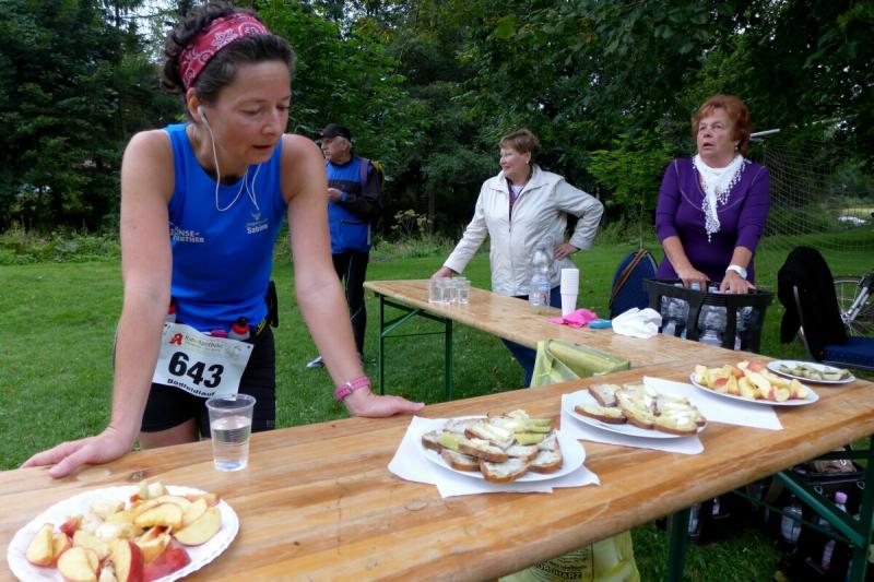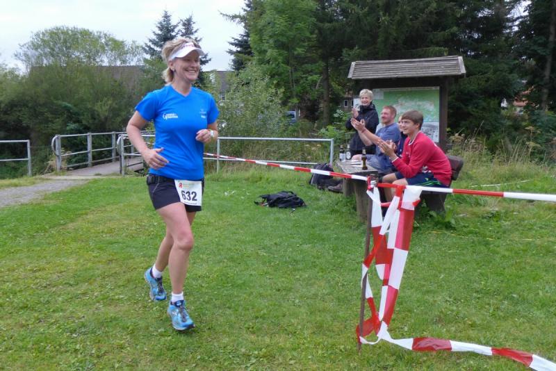 Über herrliche Wald- und Wiesenwege war bald die Talsperre Königshütte erreicht, dann ging es rasant bergab, bis den Läuferbeinen der nächste Anstieg zur Ruine Königsburg bevorstand. Es roch nach frisch geschnittenem Kiefernholz und übergroße Pilze grüßten vom Wegesrand. Am Verpflegungsstand nach 9,5 Kilometern trennten sich die Strecken und Renate Liedtkes erster Platz in der Altersklasse W60 war nur noch 500 Meter entfernt. Für die Langdistanz ging es wieder auf 500 Höhenmeter, Schwerstarbeit durch matschige Wiesen und über kurvige, wurzelreiche Trampelpfade. Scheinbar war man hier den Wolken so nahe, dass es fein nieselte, was aber eher als angenehm empfunden wurde. Der Wirtschaftsweg vor dem Stausee Mandelholz brachte weitere Erholung, bevor die Fähnchen an den Bäumen die Läufer wieder in den dichten Wald lotsten. Das Teilnehmerfeld hatte sich inzwischen weit auseinander gezogen, so dass man oft keinen Läufer mehr vor sich sah. Der Stausee war umrundet und an der Kalten Bode ging es wieder zurück nach Königshütte.