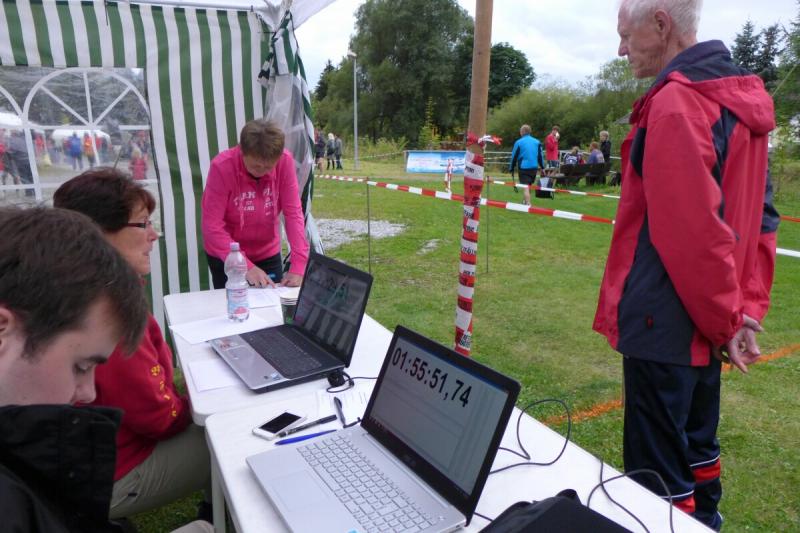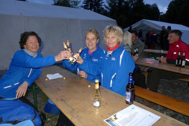 Luisa Merkel finishte nach 01:37:35 Stunden und musste noch eine viertel Stunde auf Börner warten. Trotz alledem war Börner sehr zufrieden und errang in seiner Altersklasse M50 sogar den zweiten Platz. Die beiden Sportlerinnen der Gaensefurther Sportbewegung folgten ebenso mit Platz zwei und drei. Ein Geheimtipp verriet dann die Existenz einer Dusche, welche man der Freiluftversion dankbar vorzog. Wahnsinnig glücklich über das warme Wasser, waren bald alle sichtbaren Spuren des Crosslaufs beseitigt. „Sabine Börner zur Gesamtwertung Frauen!“ schallte es durch den großen Saal. Pitschnass und nur mit einem großen Handtuch versehen, nahm Börner die Medaille für den vierten Platz in der Gesamtwertung der Frauen entgegen. Mit Luisa auf dem Podest! Zumindest beim Duschen war Börner die Allererste…