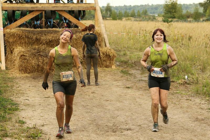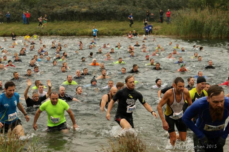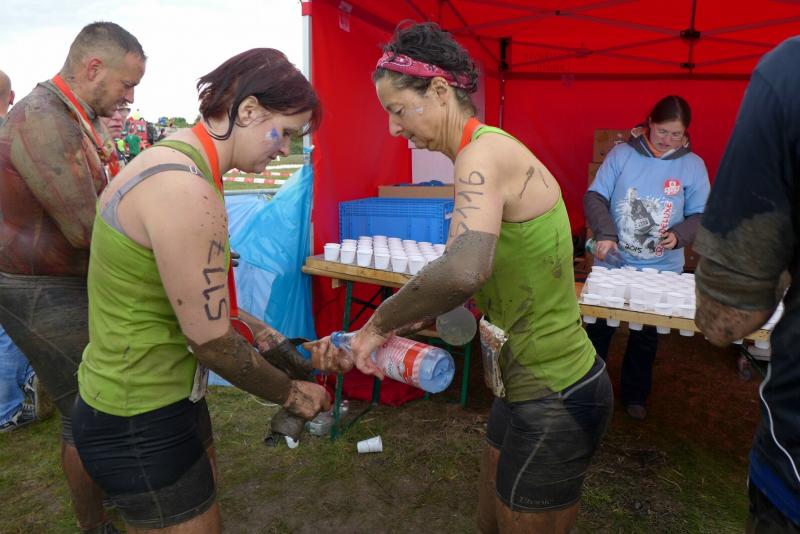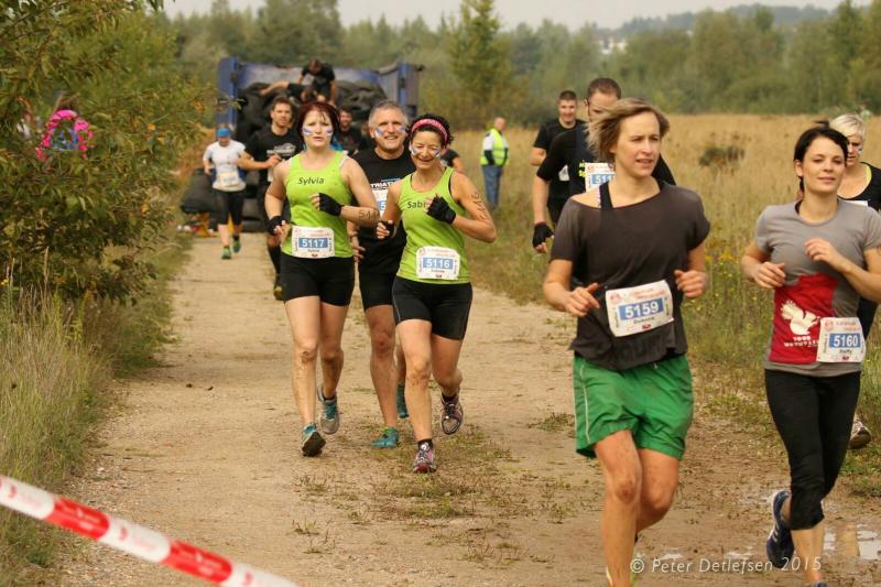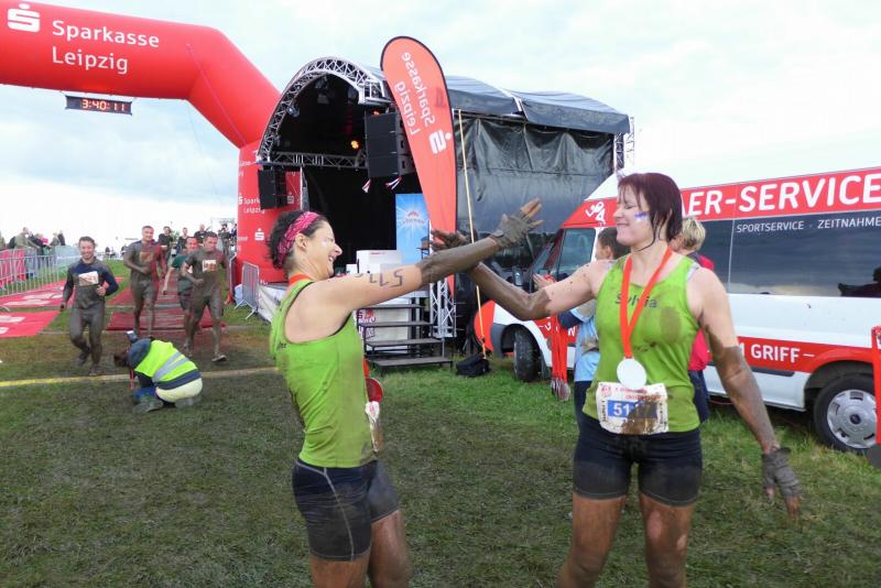 Um der großen Nachfrage gerecht zu werden und Staus an den 25 Hindernissen zu vermeiden, hatte der Veranstalter die 2000 Teilnehmer in vier Startblöcke geteilt. Gleich mit den ersten 500 Leidensgenossen, begann für die Gaensefurther ein weiteres Kapitel „Lauf extrem und unbequem“. Anfängliche Überlegungen, beim ersten Wasserhindernis mit den Schuhen in der Hand an das gegenüberliegende Ufer zu waten, zerplatzten so schnell wie Seifenblasen. Beide Arme wurden wirklich zum Schwimmen benötigt und die Schuhe hingen wie Blei an den Beinen, die so garkeiner Schwimmbewegung folgen wollten. Der Wettkampf dauerte also keine zwei Minuten und bis auf das Haupthaar war alles komplett durchnässt. Aber es hätte ärger kommen können, waren doch die Wetterbedingungen den Sportlern äußerst wohlgesonnen. Im ruppigen Gelände ging es durch erste harmlose Schlammlöcher und Röhren, bevor das „Markkleeberger Horn“ erklommen werden musste. Herabhängende Seile, Wurzelwerk und Geäst dienten dabei als Kletterhilfen. Nur war der Hang natürlich präpariert, so dass nach zwei Schritten vorwärts meist wieder einer zurück rutschte. Gut, wenn ganz oben eine rettende Hand aus dem Team wartete. Geschafft, so hart erklommen, ging es auf der anderen Seite am sichersten auf dem Allerwertesten wieder hinunter. Ab durch die grüne Hölle mit meterhohem Gestrüpp, drohten schon bald die Stromimpulse aus Weidezaunschnüren. Konzentriert und geschickt entgingen nur die Vorsichtigen dem unangenehmen Kontakt mit der Elektrizität. Endlich ging es im Kriechgang wieder durch zähen Schlamm. Nun dürften selbst die Fotografen Mühe gehabt haben, die Gestalten den nicht mehr zu entziffernden Startnummern zuzuordnen. Ein Teil vom trocken werdenden Dreck blieb dann vielleicht am nächsten Hindernis kleben. Aneinander gebundene Reifen galt es bis auf drei Meter Höhe zu erklimmen. Wer das geschafft hatte, musste dann nur noch auf der anderen Seite wieder runter kommen. Die Knie hatten in der nächsten längeren Laufeinheit dann wieder Zeit sich zu beruhigen. Gut fünf Kilometer dürften bis dahin ganz nebenbei gelaufen sein. Erneut gab es eine Abkühlung im Markkleeberger See. Nach ein paar ordentlichen Schwimmzügen ging es tropfnass auf eine Plattform. Noch etwas höher auf einem Podest, war die Variante des Eintauchens dann wieder jedem selbst überlassen. Wer hier zu wenig auf gut geschnürtes Schuhwerk oder auf eine unzureichende Befestigung seiner Startnummer geachtet hatte, der suchte mitunter vergeblich im tiefen Nass. Die 100 Treppenstufen vom angrenzenden Kanupark hinauf zur spektakulären Riesenrutsche boten sich an, dass überschüssige Wasser aus den Ohren zu hopsen. Atemlos lag sie dann vor den Crossläufern: Diese Rutsche war wirklich de Luxe! Der steil abschüssige Hang war breit mit Folie ausgelegt und Wasser beschleunigte die Abfahrt auf dem glatten Untergrund. Eine kleine Delle sorgte am Ende für das spritzige Eintauchen in die kleine Bremspfütze. Was für ein Spaß für die vielen Zuschauer. Also Augen zu, Luft anhalten und runter! Schließlich war von „Teil“-nahme die Rede. Kein Wort davon, dass man hier im Ganzen ankommen muss, scherzten die Gaensefurther. Die Stimmung im Team war großartig. Mit vereinter Kraft wurden auch die letzten Hindernisse gemeistert und kurz vor dem Ziel bereitete eine letzte Schlammpackung die richtige Stimmung für das Zielfoto. Acht Kilometer und 25 Hindernisse lagen hinter ihnen und so einige durften auch wirklich die erlösenden Duschcontainer aufsuchen. Aber doch nicht unsere Staffel! Unermüdlich und unbeirrt liefen sie durch das Ziel, direkt in Runde zwei. Der Moderator wünschte noch viel Spaß: „Ihr kennt den Weg?“