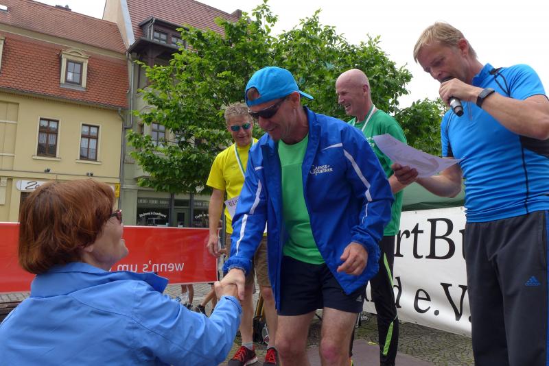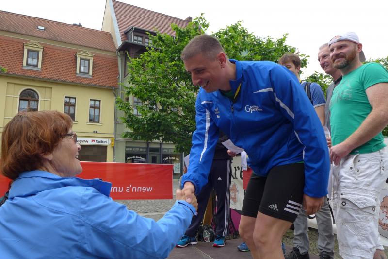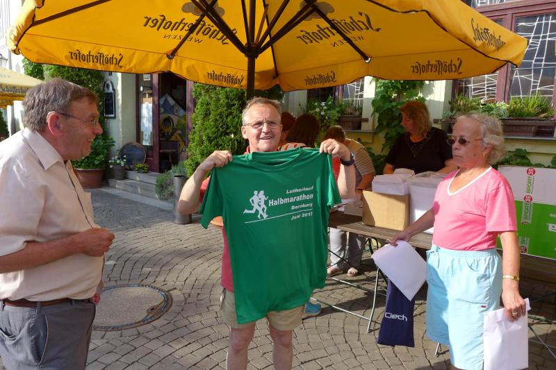 Im Hinblick auf das Reformationsjahr 2017 entschieden sich die Läufer der Gaensefurther Sportbewegung für eine Teilnahme am Luther-Lauf in Bernburg und ließen dafür schweren Herzens den Konradsburglauf in Ermsleben sausen. Unter der Federführung des KreisSportBundes Salzland e.V. (KSB) sollten die Starter aber durchaus Gefallen an diesem einmaligen Luther-Lauf haben. Als zweiter Wertungslauf in der Solvay-Cup-Serie ausgeschrieben, umrahmte bereits am Vorabend eine leckere Nudelparty die Ausgabe der Startunterlagen. Die ersten 95 Angemeldeten erhielten dann auch ihr ganz spezielles Unikat, ein Lauf-Shirt auf dem die jeweilige Luther-These aufgedruckt war. Aktueller hätte der KSB für seinen Lauf nicht werben können, wo doch geschichtlich mit den 95 Thesen gegen die Ablasspraxis am 31. Oktober 1517 die Reformation ihren Anfang nahm. 500 Jahre später nun, wo sich die neuen Erkenntnisse bis in die Gegenwart ziehen, beschreibt der Luther-Lauf einen Teil des langen Weges. Hatte sich der KSB nur auf die Halbmarathondistanz festgelegt, war die Teilnahme doch eher routinierten Läufern vorbehalten. Lediglich Walker konnten ebenfalls über diese Distanz starten.