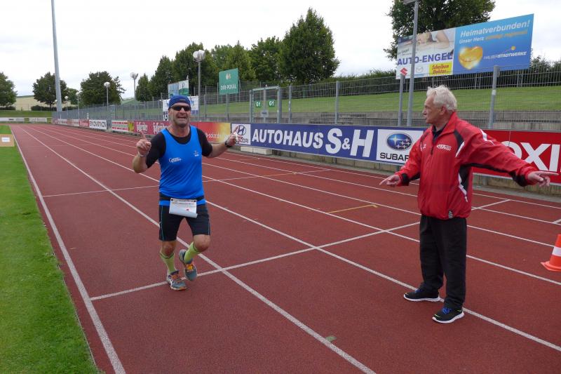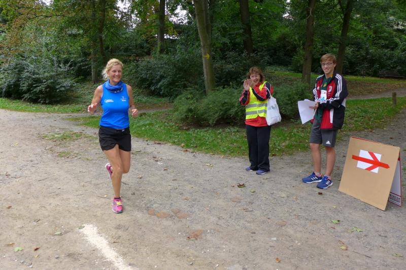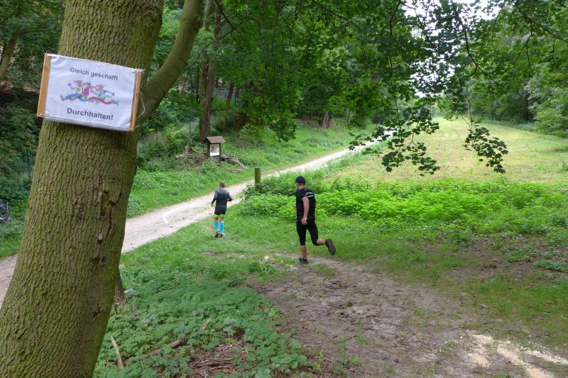 Spätestens am Treppenaufstieg über 63 Höhenmeter war der Genuss dann vorbei. Doch der Mönch belohnte die Anstrengungen mit reichlich kühlem Nass und anspornenden Worten, so dass nach kurzem Luftholen die Beine auch wieder laufen wollten. Bald war der höchste Streckenpunkt erreicht und es ging auf weichem Waldboden und auf reichlich Kienäpfeln wieder hinab. Jens-Uwe Börner, der verletzungsbedingt wandernd auf der Sechs-Kilometer-Distanz unterwegs war, freute sich, dass jeder Läufer der Langdistanz auf dem Weg zum Ziel an ihm vorbei musste. Die Actionfotos waren schnell im Kasten und einen aufmunternden Spruch gab es natürlich auch mit auf den Weg. Mit dem Schwung aus den Bergen ging es rasant in Richtung Stadion. Die Sprecherin war bereits zu hören und die letzten Meter auf der Tartanbahn waren viel zu schnell vorbei. Halberstadt, das war wieder wunderschön - ja schön war’s…