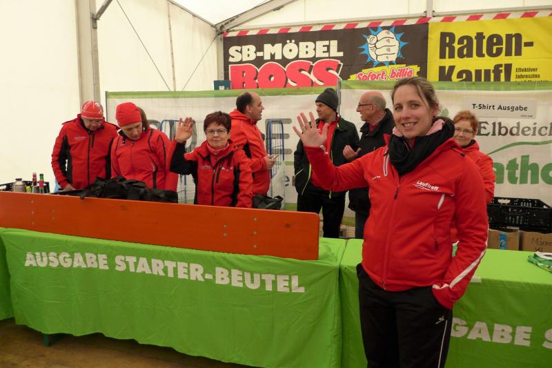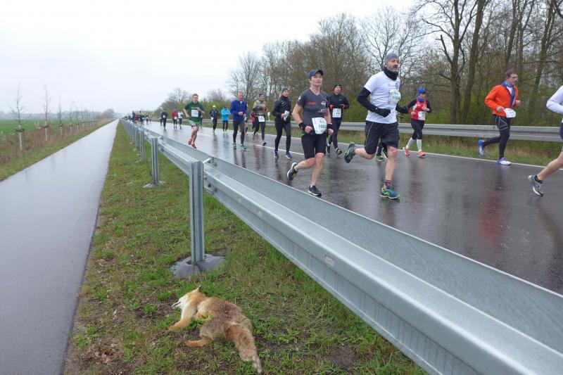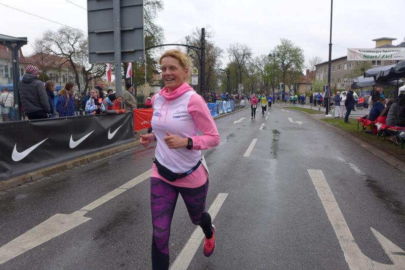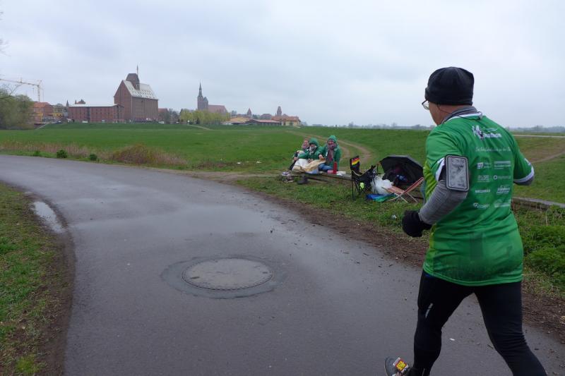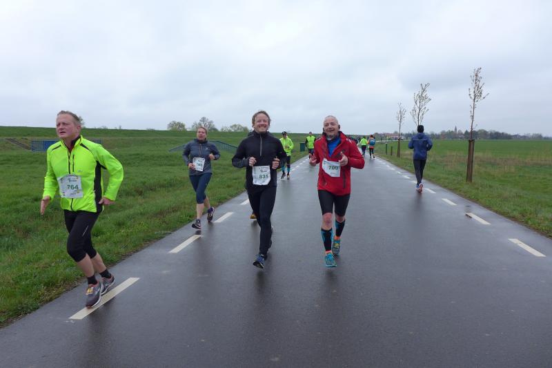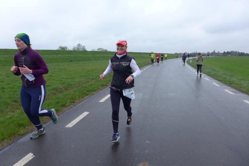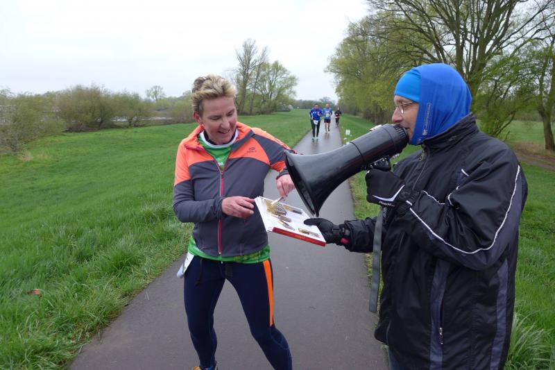Die Regeneration war noch nicht abgeschlossen und der Muskelkater noch garnicht da, als die Läufer am nächsten Morgen bereits beim Tangermünder Elbdeich Marathon an der Startlinie standen. Statt der Sechs waren nun ganze 15 Gaensefurther vertreten. Das ungemütliche Wetter setzte noch einen drauf, denn es regnete an diesem Sonntag besonders schön. Läufern macht das in der Regel nichts aus. Doch nun standen 1.800 Läufer im Pulk frierend am Start, da halfen warme Gedanken auch nicht mehr. Doch dann ging es los – auf zehn Kilometer am Deich entlang oder auf eine Halbmarathon-Runde über Bölsdorf , Buch und Schelldorf bis zurück in die Hansestadt Tangermünde. Über die Marathondistanz hatten die Bode-Runners diesmal keine Läufer am Start. Der Regen war im Ziel fast gänzlich vergessen und auch dem böigen Wind hatte man die kalte Schulter gezeigt. Fast alle Finisher über die 21,1 Kilometer landeten eine Zielzeit um die zwei Stunden. Auch Renate Liedtke finishte in Tangermünde ihren Halbmarathon überglücklich nach 02:20 Stunden. „Berlin BIG 25 kann kommen, da habe ich jetzt keine Angst mehr!“, resümierte die rüstige Sportlerin.