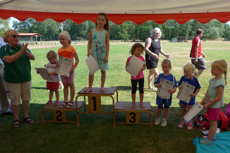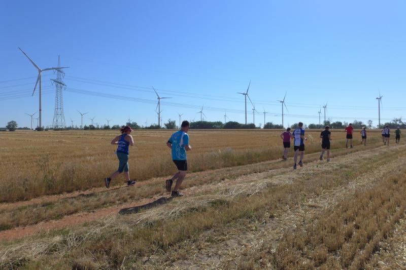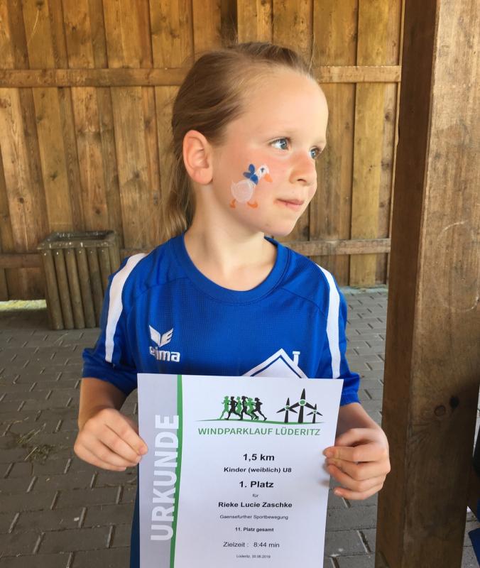 Der neu errichtete Windpark Hüselitz bildete die Kulisse zur dritten Auflage des Laufevents der Lüderitzer Vereine mit Unterstützung des SC Demker. Trotz der Temperaturen über 30 Grad, starteten 215 Läufer über die fünf angebotenen Streckenlängen. Der Moderator fand die treffenden Worte vor den Starts: „Seien sie bei dieser Hitze vorsichtig und trinken sie sehr viel. Es kommt weniger auf die Zeiten an, kommen sie gesund ins Ziel!“ Wie Recht er hatte, spendeten lediglich die Bäume am Sportplatz etwas Schatten, auf den Feldwegen brannte die Sonne erbarmungslos. Der Fanfarenzug Lüderitz eröffnete die Veranstaltung, bevor die Jüngsten auf eine Sportplatzrunde geschickt wurden. Jette Emilia Zaschke klemmte sich mit ihren fünf Jahren an Papas Sohlen und beendete die 400 Meter mit einem vierten Platz bei den bis achtjährigen Läufern. Über die 1,5 Kilometer ihrer Schwester Rieke Lucie Zaschke hatten die Beine des in der Altersklasse M45 startenden Papas dann etwas Mühe zu folgen. Mit 46 Sekunden Vorsprung auf Platz zwei, siegte Rieke souverän in der jüngsten Altersklasse. Wenn sie so weiter trainiert, wird sie ihr Ziel, einmal fünf Kilometer zu laufen, sicher bald umsetzen. Laut Empfehlung der Deutschen Leichtathletikordnung ist diese Streckenlänge aber erst ab Altersklasse U12 zu werten. Rieke wird also noch eine ganze Weile warten müssen.