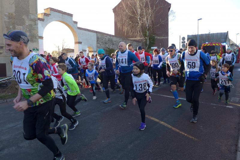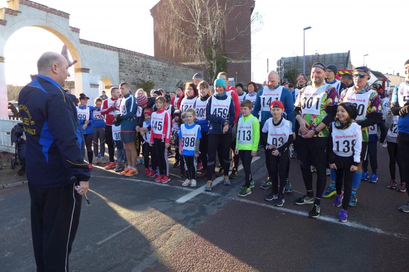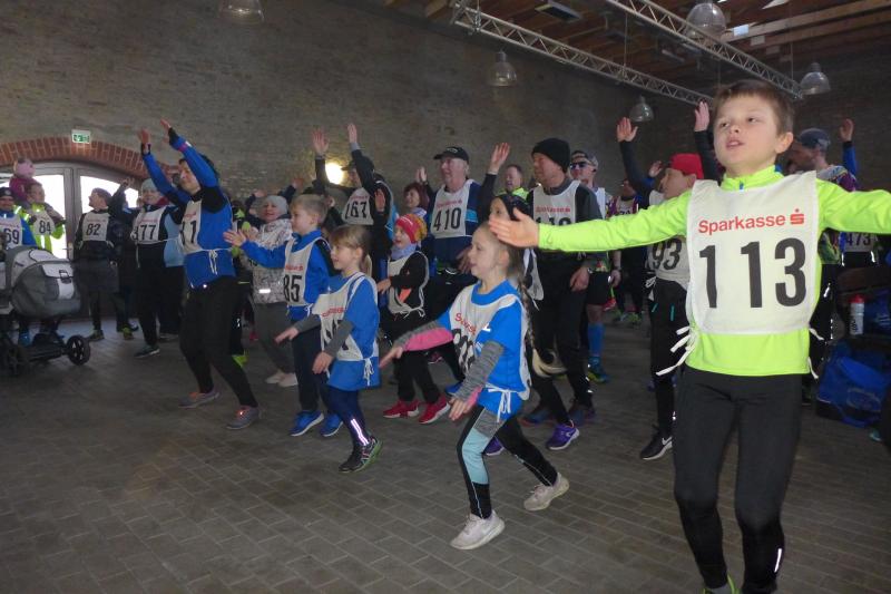 Das ließ er sich nicht nehmen! Der Aderstedter Bürgermeister Mike Franzelius bestand vor dem Start des Neujahrlaufes auf „sein“ Gruppenbild mit allen Teilnehmern. Den Wunsch erfüllten die 79 Starter natürlich gerne und reihten sich vor der Festscheune diszipliniert auf. Ungeachtet aller Vorbereitungen die so eine Laufveranstaltung mit sich bringt, hatte Franzelius bereits die fünfminütige Erwärmung gestemmt und die Ungeduldigen somit auf Betriebstemperatur gebracht. Bei angenehmen Lauftemperaturen standen dann alle Starter über eins und sechs Kilometer zappelig an der Startlinie. „Die Kinder laufen ihren Kilometer links, dann links und nochmal links!“, so der Bürgermeister, der sich auch für den erlösenden Startschuss bereitgestellt hatte. Los ging es, und noch mit den gesprochenen Worten im Ohr, liefen die Knirpse nach dem zweiten Links auch gleich das dritte Links, ohne den weisenden Streckenposten je gesehen zu haben und kürzten somit die Runde ab. Nur zwei Insider liefen wirklich einen Kilometer und kamen etwas verdutzt und ohne Verfolger ins Ziel. Die Aufregung war aber schnell vergessen, denn am Ende gab es für alle Kinder nicht nur eine Medaille, auch ein kleines Präsent durfte jeder mit nach Hause nehmen.