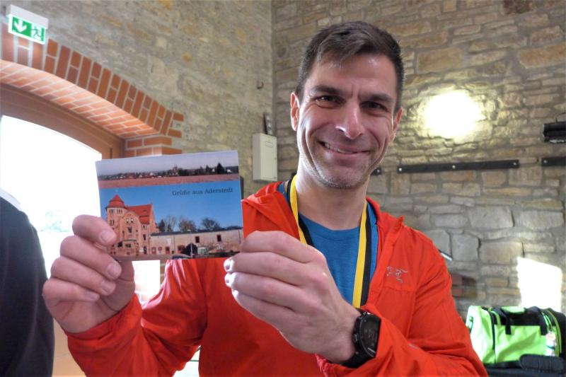 Alle Starter über sechs Kilometer fanden, nach einem kleinen, versehentlichen Abstecher der drei Führenden, dann den richtigen Abzweig hinaus aus Aderstedt, Richtung Autobahn A14, vorbei am „Bullenstedter Brocken“. Da waren im Vorjahr noch sieben Kilometer zu bewältigen. Auf Grund des schlechten Untergrundes hatte das Organisationsteam die Strecke um einen Kilometer gekürzt. Allen Genussläufern, die noch den vorbeisausenden Fahrzeugen von der Autobahnbrücke zuwinkten, kamen die ersten „Rückläufer“ schon recht früh wieder entgegen. Mit im Feld der führenden Männer war auch Dirk Meier von der Gaensefurther Sportbewegung. Am Ende musste er nur Gunnar Falke aus Calgary (Kanada) den Vortritt lassen. Der Ex-Bernburger war gerade auf Heimaturlaub und lief in Aderstedt mit einer Siegerzeit von 23:28 Minuten die sechs Kilometer zu Ende. Rang drei belegte kein Unbekannter - Peter Teutloff aus Aschersleben holte sich die Lorbeeren. Bei den Frauen liefen sogar zwei Bode-Runners auf das Treppchen! Sandra Homann nahm den Gesamtsieg mit nach Hause, Petra Becker konnte vor Karin Taraba vom PSV Bernburg den zweiten Platz für sich verbuchen. Für das leibliche Wohl war bestens gesorgt, so dass in gemütlicher Runde noch die vielen bevorstehenden Laufziele ausgetauscht werden konnten. Der Gast aus Kanada hatte am Ende nicht nur seine Finishermedaille im Gepäck. Auch eine Postkarte aus Aderstedt trat mit ihm die Heimreise an…