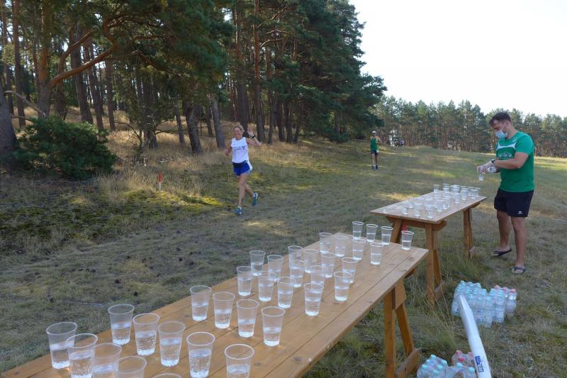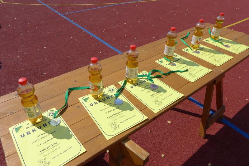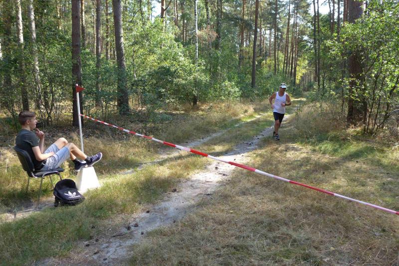 Was den Untergrund betraf, hatte die Strecke alles zu bieten und verdiente zweifelsohne das Prädikat „Cross“. Betonplatten führten über die erste Anhöhe, bevor eine Gabelung die Kurzstrecke über drei Kilometer bald von der Sechs-Kilometer-Distanz trennte. Auf weichen Waldwegen musste man lediglich den zahlreichen Kienäpfeln ausweichen. Ganz nach dem Geschmack für Barfußläufer, wechselten sich holprige Stoppelwiesen mit tiefen Sandwegen ab, bevor auch schon wieder eine weitere Anhöhe zu erklimmen war. Ehe es aus dem Wald hinaus auf eine Lichtung ging, versorgte ein Verpflegungsstand mit Getränken. Der Hinweis, die leeren Becher wieder in die bereitgestellten Abfallbehälter zu werfen, brachte manchen Läufer aus dem Tritt, denn oft verfehlte die Arm-Motorik das enge Ziel. Das muss vor den nächsten Wettkämpfen unbedingt geübt und weiter verinnerlicht werden! Die große Lichtung erlaubte eine Ausschau auf das Renngeschehen, machte Abstände sichtbar und offerierte eine weitere Anhöhe, die zu bewältigen war. Aber es ging dann auch mal bergab, bevor ein Streckenposten bei Kilometer 5,3 die letzte Steigung ankündigte. Die geschafft, ging es für alle Sechs-Kilometer-Läufer rasant bergab in das wohlverdiente Ziel.