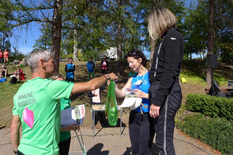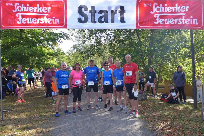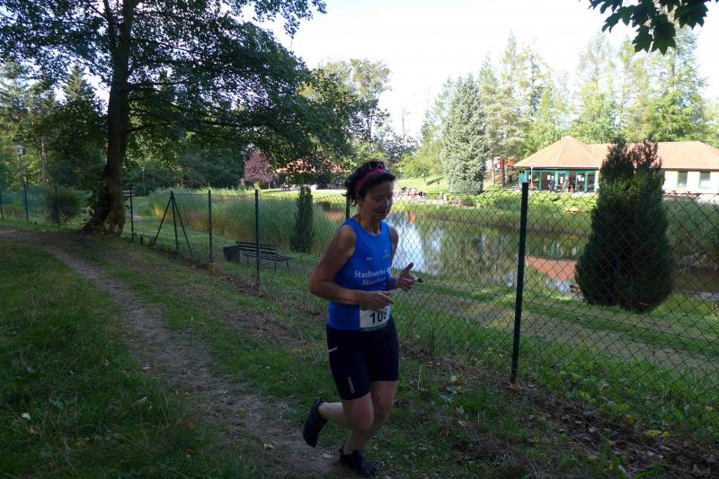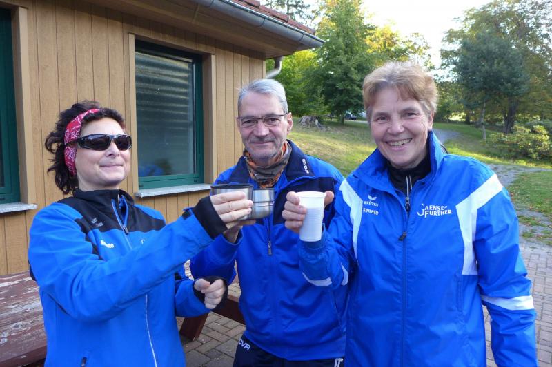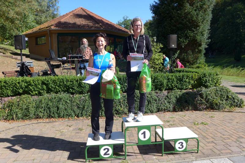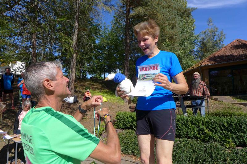 Auch Sandra Homann konnte erneut ihre gute Form vom Parchener Fiener-Crosslauf abrufen und siegte in Friedrichsbrunn in der Altersklasse W40. Im Zehn-Sekunden-Takt wurden die Läufer in Zehnerteams auf die Strecke geschickt, so dass sich im Startbereich keine Menschenansammlung bilden konnte. Da die Läufer nach dem Alphabet sortiert waren, gehörten Olaf Bothe, Jens-Uwe und Sabine Börner gleich zum ersten Starterfeld. „Oh Nein, ihr werdet mich alle jagen!“, machte sich bei Börner ein mulmiges Gefühl breit. Doch ziemlich schnell hatten alle flinken Beine die Genussläufer überholt. Auf der herrlich waldreichen Strecke ging es über zwei Fünf-Kilometer-Runden ordentlich hoch und runter. „Durchlaufen, nur nicht gehen!“, war das ausgemachte Ziel von Börner, was Atmung und Kreislauf gehörig ankurbelte. Böse nur, dass das Ziel bei Kilometer vier und acht bereits zum Greifen nahe war. Doch es ging noch einmal für fast zwei Kilometer in den Wald hinein und zwei Anhöhen wollten auch noch von den Läufern erklommen werden. Das gelang vielen gut und die langen Schatten deuteten den Vorauseilenden die nahende Bedrohung rechtzeitig an. Lag es nun an den tiefen Sonnenstrahlen die blendeten, an einem verpassten Wegweiser oder ganz einfach daran, dass Edgar Schmidtke keinen Läufer mehr vor sich hatte? Egal, auf jeden Fall ging es auf der ersten Runde nicht hinein nach Friedrichsbrunn! Schmidtke: „Es waren vielleicht 700 Meter die ich falsch gelaufen bin!“, resümierte der Bode-Runner. Spätestens auf dem Podest entspannte sich sein Gesicht aber wieder, denn trotz des Abstechers feierte der Finisher den zweiten Platz in der Altersklasse M55. „Auf die sechs Minuten Abstand zu Platz eins wäre ich nicht mehr rangelaufen!“, ist sich Schmidtke ziemlich sicher. Als dann noch Jens-Uwe Börner für den dritten Platz seinen Fotoapparat in fremde Hände geben musste, freute sich der Veranstalter WSV Grün-Weiß Friedrichsbrunn über den Jubel der Bode-Runners, die ihren beiden Lauffreunden lautstark Applaus spendeten. Schnell nahm er sein liebstes Gerät wieder an sich, sprintete doch Renate Liedtke nun auf das oberste Podest. Sie war zwar die Einzige in ihrer Altersklasse W65, hatte aber an diesem Tag alle geschlagen, die auf ihrer Couch liegen geblieben waren.
