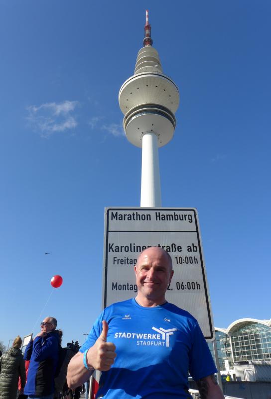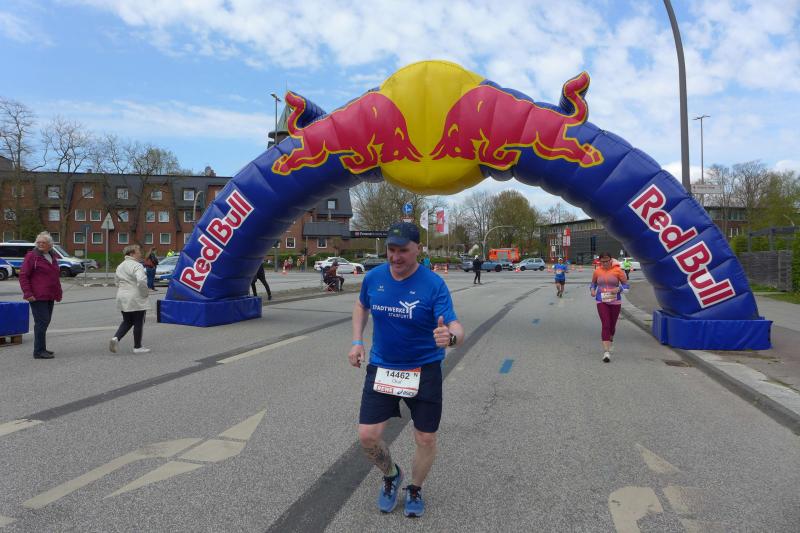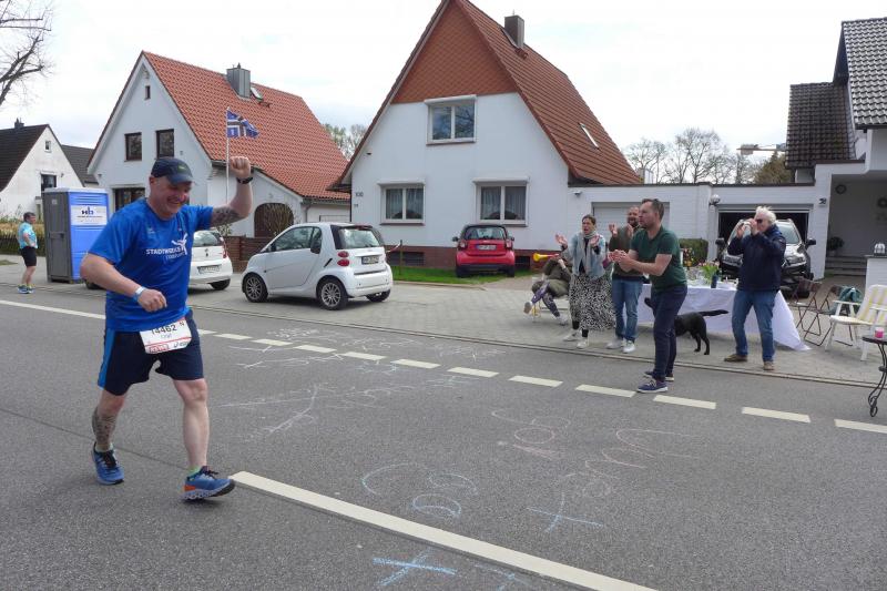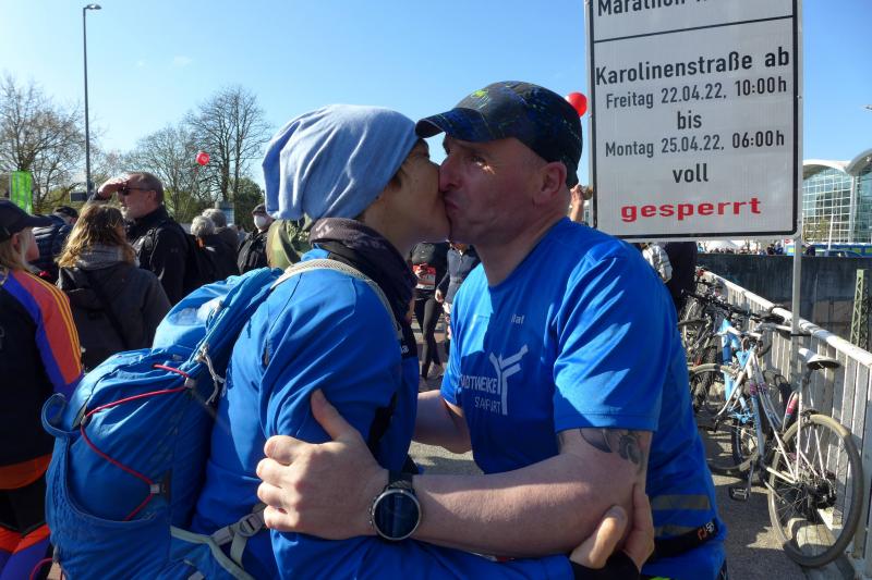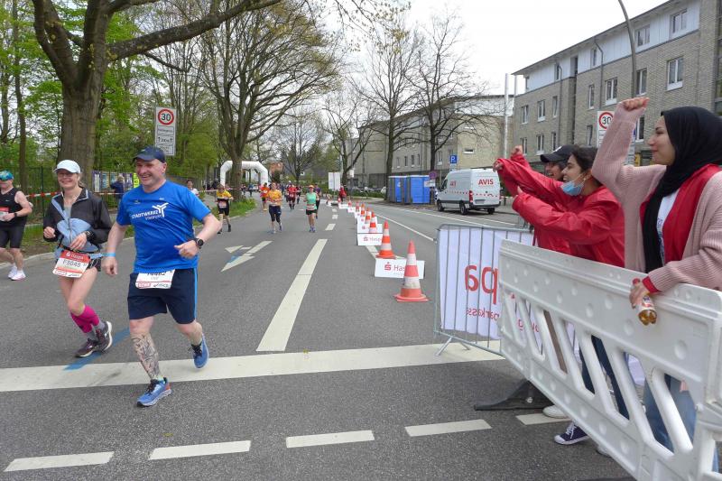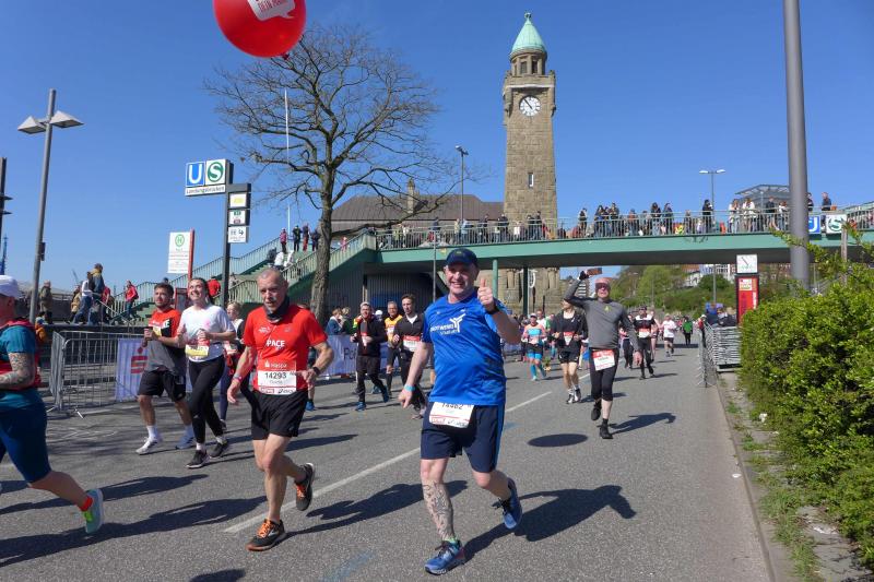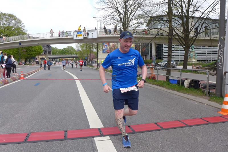 Nach coronabedingter Zwangspause im vorigen Jahr, war der Startplatz für Bothe in 2022 quasi reserviert. Da mussten die aktuellen Wettkämpfe erstmal mit dem Trainingsplan abgestimmt werden. Doch der Halbmarathon in Berlin und ein abschließender 30 Kilometer-Lauf auf heimatlichen Wegen, waren dann Vorbereitung genug. "Bist du aufgeregt?", fragte der mitgereiste Fanclub nach dem Einchecken im Hotel? "Nicht die Bohne", lauschte Bothe in sich hinein. Spätestens als er dann die Startnummer in den Händen hielt, stieg die Anspannung auch bei dem Debütanten. Über die Streckenlänge von 42,195 Kilometer ist Bothe noch nie am Stück gelaufen. Durchhalten und ankommen war das ausgemachte Ziel, eine Zeitvorgabe wollte Bothe sich nicht machen. Während dem Lauffreund frühzeitiges Zubettgehen ans Herz gelegt wurde, studierte Jens-Uwe Börner U-Bahn-, Zeit- und Streckenpläne entlang des Marathons. Mit einer Tageskarte der Bahn, ließ sich der zuschauerfreundliche Kurs mehrfach ansteuern. War das Läuferfeld erstmal unterwegs, hatte Börner insgesamt fünf Zwischenstationen ausgemacht, um Bothe an der Strecke abzupassen, ein Stück mitzulaufen und mit zunehmenden Kilometern natürlich zu motivieren. Und dann war Bothe endlich unterwegs. Die Tränen von Ehefrau Nancy trockneten andere Bode-Runners: "Er schafft das! Er ist gut trainiert und er hat Spaß auf der Strecke!", beruhigten die Lauffreunde, nachdem der Startschuss so viele Emotionen freigesetzt hatte. Wie vereinbart, verteilte sich die mitgereiste Fangemeinde an der 42 Kilometer langen Partyzone. Nachdem die Führungsfahrzeuge für die Profis auf der Strecke Platz gemacht hatten, folgte der nicht abreißende Strom der Volksläufer. Da brauchten auch die zahlreichen Zuschauer an der Strecke eine ordentliche Portion Ausdauer für ihr Motivationsprogramm. Bei den ersten beiden Anlaufpunkten hatte Börner Glück, denn Bothe war eigentlich zu schnell unterwegs und viel zu zeitig am anvisierten Streckenpunkt. Die Stimmung war einmalig: „Adrenalin ohne Ende!“, klatschte Bothe seinen Streckenmotivator ab und ließ sich vom Strom mitziehen. Reeperbahn und Elbchaussee lagen hinter ihm, als mit den Landungsbrücken ein weiteres Highlight anstand. Die Familie konnte das Oberhaupt in der Menge ausfindig machen und feierte ihn noch vor der imposanten Elbphilharmonie. Hafencity und Speicherstadt durften nicht fehlen, bevor Bothe von der Kennedybrücke den tollen Blick über die Binnenalster wahrnahm.