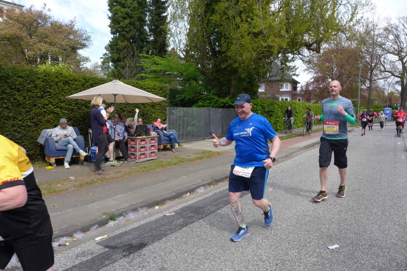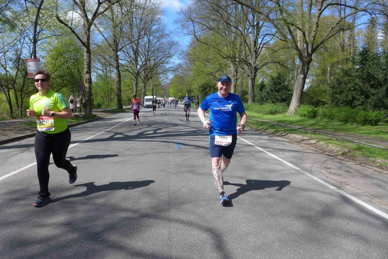 Während sich bei den Männern der Kenianer Cybrian Kotut mit einer Endzeit von 02:04:47 knapp vor Stephen Kissa aus Uganda mit 02:04:48 durchsetzte, lief Yalemzerf Yehualaw bei den Frauen eine sensationelle 02:17:23. Da war für Bothe gerade Halbzeit. Es ging weiter Richtung Stadtpark und die markante Kilometermarke 30 nährte sich. Weiter war Bothe noch nie gelaufen und unter Läufern ist bekannt, dass ab 30 der eigentliche Marathon beginnt. Daher hatten sich Tina und Sabine Börner in Ohlsdorf, dem nördlichsten Punkt der Strecke positioniert, um Bothe für die letzten zwölf Kilometer zu pushen. Die beiden wussten genau, wie jetzt jeder Schritt schmerzen konnte und der Abstand der Kilometerschilder scheinbar immer länger werden würde. Nun ging es nur noch in eine Richtung, nämlich in Richtung Ziel! Im Stadtteil Rotherbaum grüßten die Zuschauer noch einmal von der Außenalster, bevor es schnurstracks auf den Funkturm zuging.