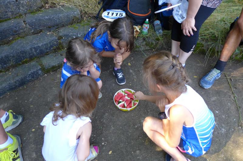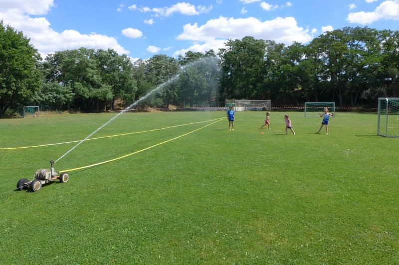Der Schnupperlauf über einen Kilometer war für den Bode-Runners-Nachwuchs schnell Geschichte, so dass sich Lenya und Emily im Schatten oder unter dem Rasensprenger des SV Grün-Weiß Giersleben schnell wieder akklimatisieren konnten.