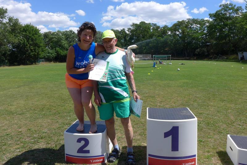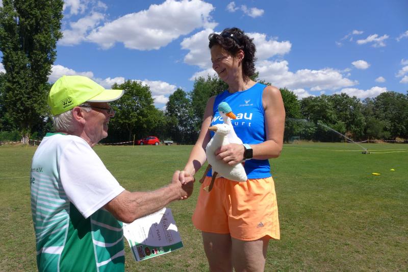 Noch einige Bode-Runners wurden in Giersleben auf das Treppchen gerufen. In sengender Mittagsglut wurde Peter Gieseler vom gastgebenden Verein nicht müde, allen Platzierten mit einem kräftigen Händedruck, einer Umarmung oder sogar mit Küsschen hier und Küsschen da zum erlaufenen Erfolg zu gratulieren. Man kennt sich eben, eine herzliche und ungezwungene Atmosphäre, zu der die Bode-Runners der Gaensefurther Sportbewegung im nächsten Jahr gerne wieder auflaufen.