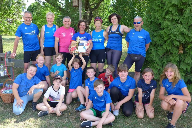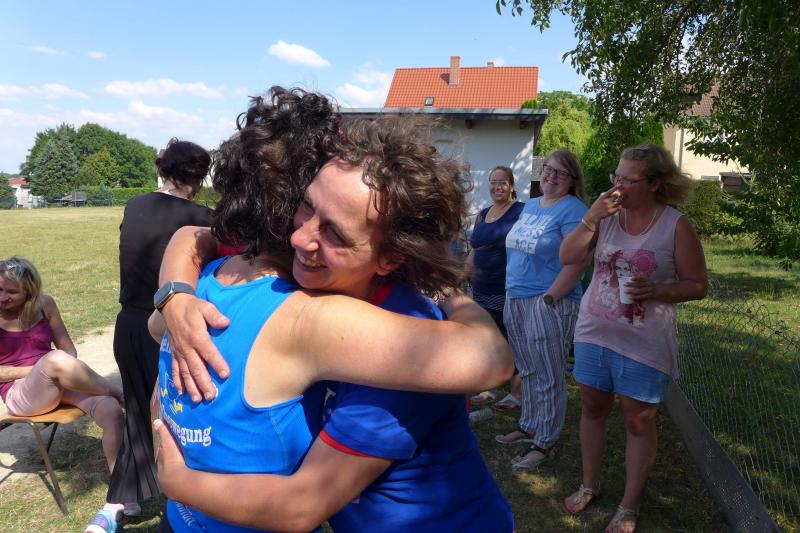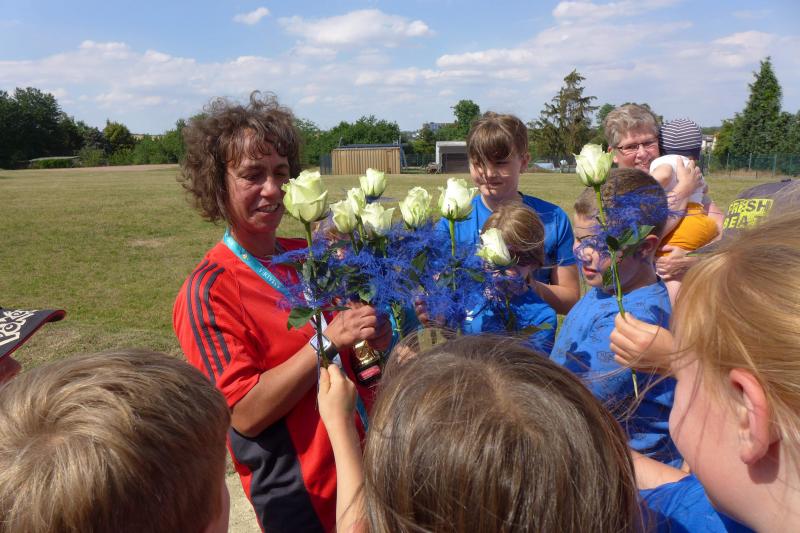 Einen tragischen Verlust muss indes die Kinder-Trainingsgruppe der Gaensefurther Sportbewegung verkraften. Mit den letzten Schultagen endete für die elf Kinder von sieben bis zehn Jahre das Training mit ihrer Silke. Der Umzug in eine andere Stadt ist leider nicht abzuwenden. Dabei hatte sie mit Überbringung dieser traurigen Tatsache wohl am meisten zu kämpfen. Als die Kinder und Eltern die langjährige Übungsleiterin zur letzten Trainingseinheit nun mit einer kleinen Abschiedsfeier überraschten, nahmen die Tränen ihren Lauf. Jedes Kind verabschiedete sich mit einer Rose, natürlich in den Gaensefurther Vereinsfarben blau/weiß. Ein Erinnerungs-T-Shirt für die beste Trainerin der Welt und ein Pokal durften natürlich nicht fehlen. Auch Vertreter der Laufgruppe überbrachten im Namen des Vorstandes ein kleines Dankeschön für die wichtige Arbeit mit den Kids. Silke Vorrath versteht es gut, das Einmaleins der Leichtathletik neigungs-, altersgerecht und spielerisch zu vermitteln. Mit den Sportanlagen rund um die Hecklinger Grundschule hat die temperamentvolle Kindergruppe auch alle Möglichkeiten für ein abwechslungsreiches Training. Doch wie kann es nun weitergehen? Diese Frage wüsste auch Vorrath allzu gerne beantwortet. Im Moment steht ein Übungsleiter-Papa in den Startlöchern, der erstmal alle 14 Tage das Dienstagstraining übernehmen wird. Freiwillige vor, die Gaensefurther Sportbewegung und allen voran die Kinder-Leichtathletikgruppe, sucht dringend nach ein, besser zwei tatkräftigen Unterstützern. Interessenten melden sich sehr gerne direkt bei der Kindergruppe, die immer dienstags ab 15:30 Uhr trainiert oder per E-Mail bei den Bode-Runners unter laufgruppe@gaensefurther-sportbewegung.de, damit ein kräftiges "Sport frei!" weiterhin für Begeisterung bei dem Sportlernachwuchs sorgt...