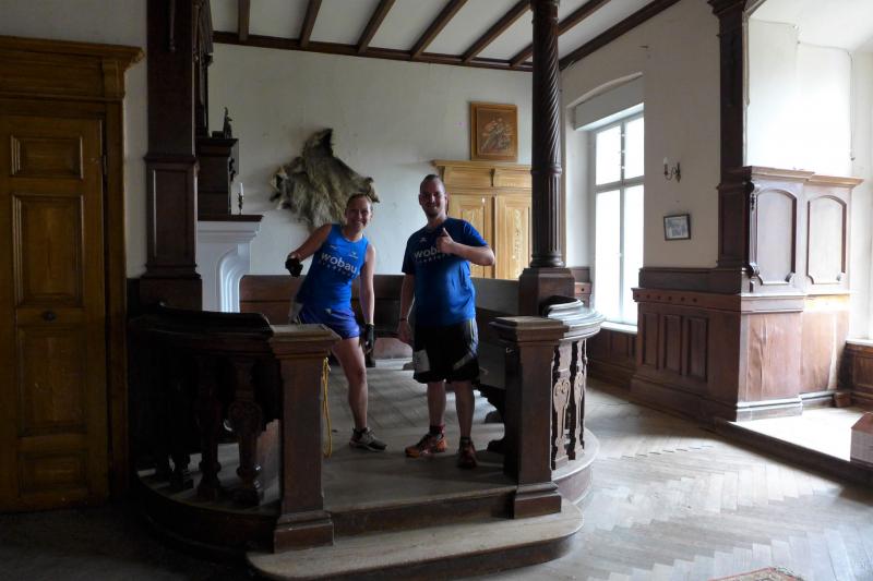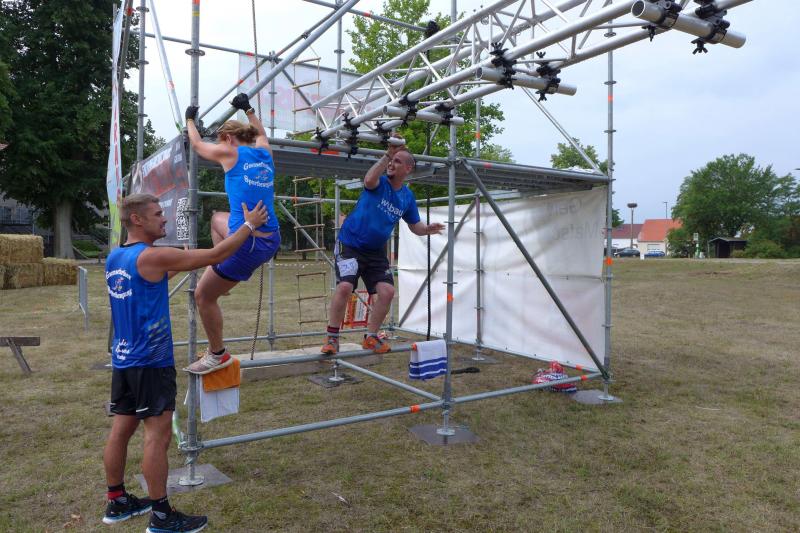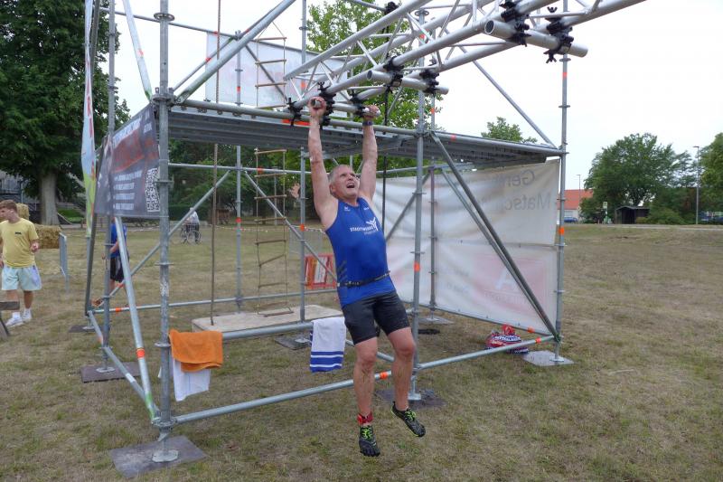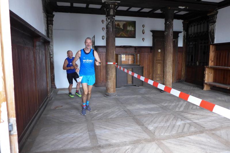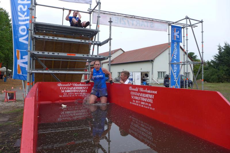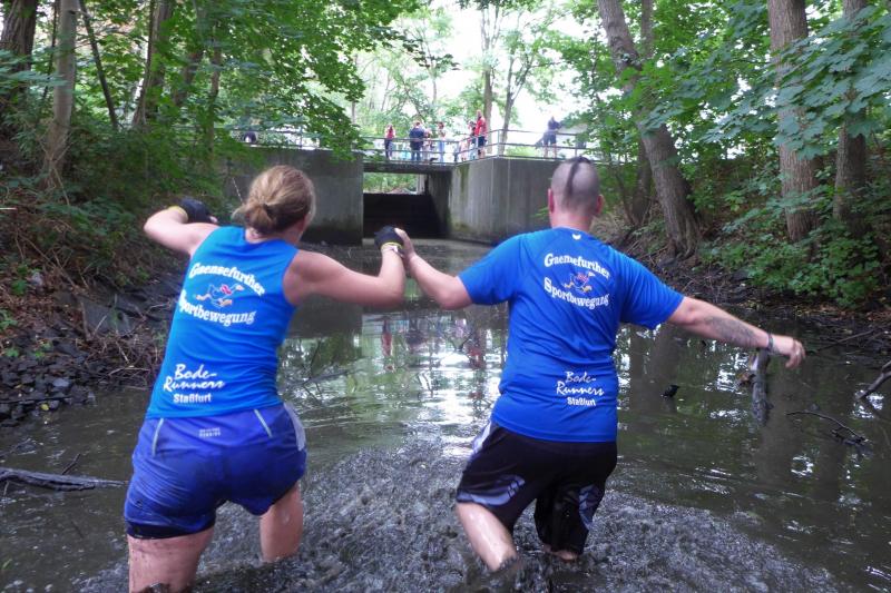 Bei der Genthiner Matschwolke waren auf jeden Fall ganze sieben Matschgänse auf einem Streich, oder besser geschrieben, in einem Team dabei. Die fünfte Auflage hatte ihren Start zum ersten Mal in Parchen. Hier sind die Bedingungen einfach noch besser, meint Mitorganisator Falk Heidel und filmte die Gaense, wie sie sich treppauf, treppab durch das altehrwürdige Parchener Schloss schoben. Mancher Streckenabschnitt war den Bode-Runners bereits vom Fiener Cross bekannt, doch da mussten sie nicht durch den hüfttiefen Mühlgraben oder zähen Morast waten, Fässer von A nach B transportieren oder auf einer Slag-Line balancieren. Die schnellsten Beine hatte man nach vorn beordert, was durchaus Sinn machte, belegten die ersten vier Matschgänse doch den zweiten Rang in der Teamwertung. Nach 30 verrückten Hindernissen und zwölf langen Kilometern, waren dann alle Bode-Runners wohlbehalten wieder im Ziel. Ein letzter Tauchgang, um sich eine der begehrten Finishermedaillen vom Grund des Containers zu fischen, gehörte inzwischen genauso zum Ritual, wie das strahlend weiße Handtuch für alle, die am Ende aus dem Dreckwasser auftauchten.