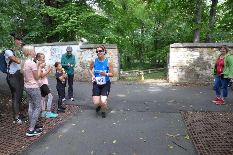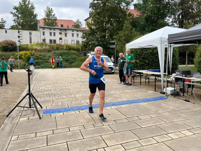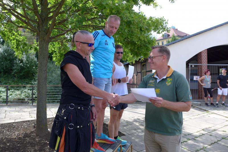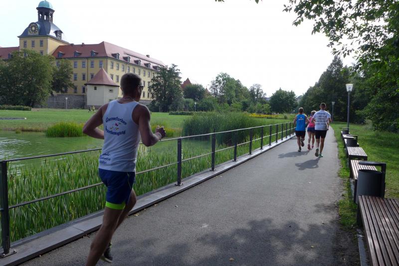Für einige Bode-Runners der Gaensefurther Sportbewegung war die Nacht kurz, fiel der erste Startschuss zum elften Cuplauf in der Novo-Nordisk-Wertungsserie im weit entfernten Zeitz bereits um zehn Uhr. Ein paar Teilnehmer mehr hätte sich die SG Chemie Zeitz schon gewünscht, zumal die Veranstaltung als Landescup ausgetragen wurde. Die Damen gingen zuerst auf ihre fünf Kilometer, die Herren absolvierten eine Stunde später die doppelte Distanz. Der schnelle, kurvige Kurs durch den Schlosspark Moritzburg und das leidenschaftliche Anfeuern durch die Vereinskollegen, ließ den Puls von Anfang an höher schlagen. Einen wahren Krimi verfolgte man an der Strecke über zehn Kilometer bei Stefan Sindermann, der sich zum ersten Mal seinen unmittelbaren Konkurrenten Heiko Naumann vom SV Glauzig vornahm. "In Schierke war ich schon dicht dran, heute greife ich an!", puschte sich der Sportler bereits vor dem Startschuss. Da hätte vor lauter Animation Daniel Wuwer doch fast seine eigene Siegerehrung verpasst. Nur ein Sprint zum Siegerpodest rettete seine Ehrung über Platz zwei in der Altersklasse M40 über die fünf Kilometer. Sindermanns Schottenrock kam diesmal auch erst auf dem Podest zum Einsatz, mit dem er stolz auf Platz zwei vor Naumann seinen Preis in Empfang nahm.