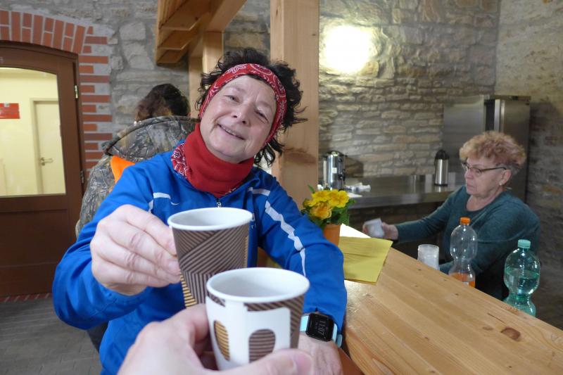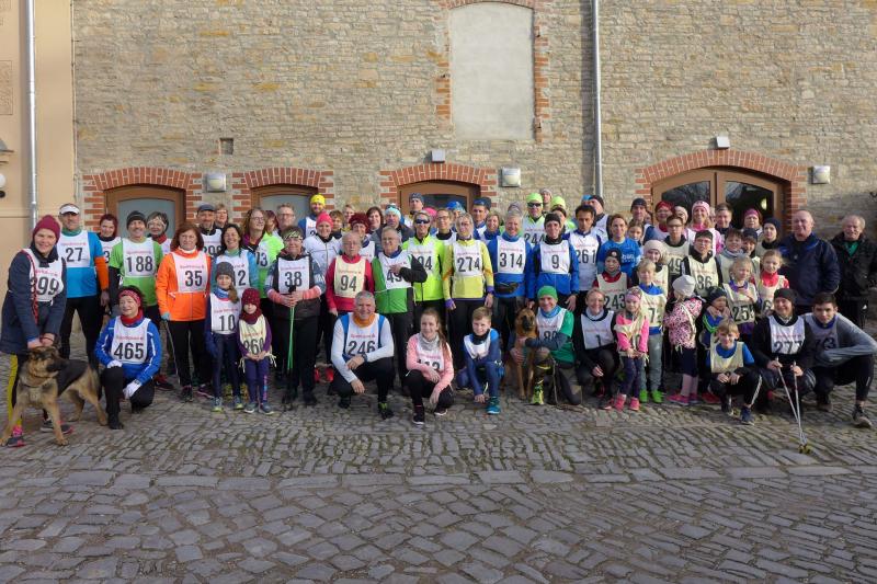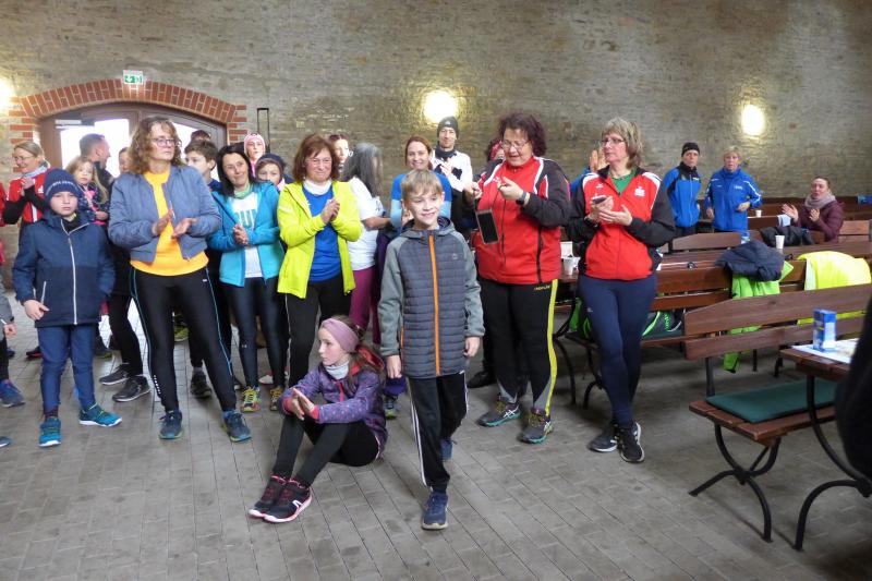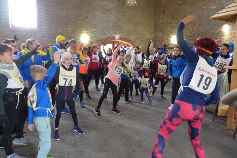 "Start um Zehn, elf Uhr Siegerehrung, ab 13 Uhr Regen!", so konnten die Bode-Runners den groben Fahrplan aus dem Chat der Trainingsgruppe entnehmen. Bis Mittag war also gutes Wetter angesagt, worauf sich auch zahlreiche Läufer und Walker zum Neujahrslauf in Aderstedt einfanden. Die Wiedersehensfreude war groß, denn nicht alle hatte man vorige Woche bereits beim Punschlauf gesehen. Die Höhe der Startgebühr konnte sich jeder Teilnehmer selbst überlegen und in der bereitgestellten Spendenbox entrichten: „Wir brauchen neue Startnummern!“, galt der Ansporn für eine hohe Summe. Dabei befanden die meisten Starter doch gerade die urigen Nummern aus Stoff, die als Leibchen um den Oberkörper gebunden wurden, als sehr originell. Im strahlenden Sonnenschein hielten die Vereine oder teilnehmenden Familienmitglieder ihre ersten Gruppenbilder für die Nachwelt fest. Die junge Hündin Paula, die zum ersten Mal mit den Bode-Runners der Gaensefurther Sportbewegung auf Reise ging, hielt mit Frauchen Renate noch respektablen Abstand zur Gruppe. Bei der Erwärmung in der großen Festscheune warteten die beiden lieber brav vor der Tür.