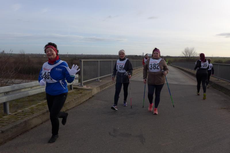 Und dann ging es auch schon los! Für die Kleinen auf die Ein-Kilometer-Runde durch den Ort, für die Großen in Richtung Autobahnbrücke. Am Ende des Läuferfeldes reihte sich auch Paula mit ihrem Frauchen ein. Ein Stückchen wollten sie nur mitgehen, wenn Frauchen nicht mehr kann, geht’s wieder zurück. Derweil waren die Läufer auf der Brücke angekommen und natürlich gingen freundliche Grüße an alle winkenden Autobahnfahrer. Bald waren 2,5 Kilometer absolviert und der Wendepunkt erreicht: „Auf der Stelle hopsen, das macht wieder warm!“, versuchten die Sportler den festgefrorenen Streckenposten wieder einzuheizen.