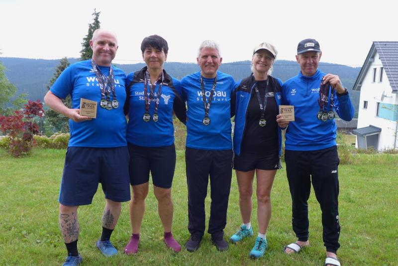 Geringfügig länger waren dagegen die Teilnehmer des Sachsen-Trails im erzgebirgischen Breitenbrunn unterwegs. Ein ganzes Wochenende konnten sich die fünf Bode-Runners der Gaensefurther Sportbewegung dort beim „Trailrunning“ austoben. Dabei waren die angebotenen Strecken mit etlichen Höhenmetern gespickt. Über den Erzgebirgskamm erstreckten sich wundervolle Laufkulissen. Schmale Pfade, steile, langgezogene An- und Abstiege galt es zu erobern. Beim UltraTrail über wahnsinnige 75,5 Kilometer hatte Jens-Uwe Börner ganze 2.120 Höhenmeter vor sich. In 13 Stunden musste die Distanz absolviert sein, so das vorgegebene Zeitlimit des Veranstalters. Vor dem frühen Start um sieben Uhr wurde die Ausrüstung der Ultraläufer kontrolliert, denn die Mitnahme von mindestens einem Liter Getränke, Energieriegel oder Gel war verpflichtend. Sogar ein Trinkbecher und ein Handy mit Landkarte waren mitzuführen. Dazu trainierte Börner im Vorfeld mit einer eng anliegenden Laufweste, die Getränkefächer und ausreichend Stauraum hatte. „Da muss ja auch meine Leselupe mit!“, schlussfolgerte der Ultraläufer, wäre die Bedienung des Handys doch sonst unmöglich gewesen. Der Wahnsinnige war schon lange unterwegs, als auch die Vereinsfreunde über die halbe Ultradistanz, 20 oder 11,5 Kilometer auf ihre Strecken geschickt wurden. Eins hatten alle Trails gemeinsam: den Zieleinlauf! Die letzten 3,5 Kilometer zum Sportpark Rabenberg ging es brachial berghoch. „Lasst den Brustkorb krächzen, bevor ihr keuchend und fluchend durchs Ziel krabbelt!“, feuerte der Moderator die Finisher auf ihren letzten Metern nochmal an: „Bringt die Keulen so richtig zum Glühen!“ Lange wartete man im Ziel auf Börner. Eine dreiviertel Stunde vor Zielschluss lief der Ultraläufer dann auf dem Plateau des Rabenbergs ein. Langsam, humpelnd und schwer atmend aber mit Tränen voller Glück in den Augen. Am letzten Renntag durfte Börner seine Wunden lecken und die Lauffreunde waren wieder gefordert. Da Detlef Schäfer und Olaf Bothe an allen drei Tagen eine Strecke absolvierten, gab es zur Siegerehrung einen ganz besonderen Holzpokal für die beiden Gaensefurther.