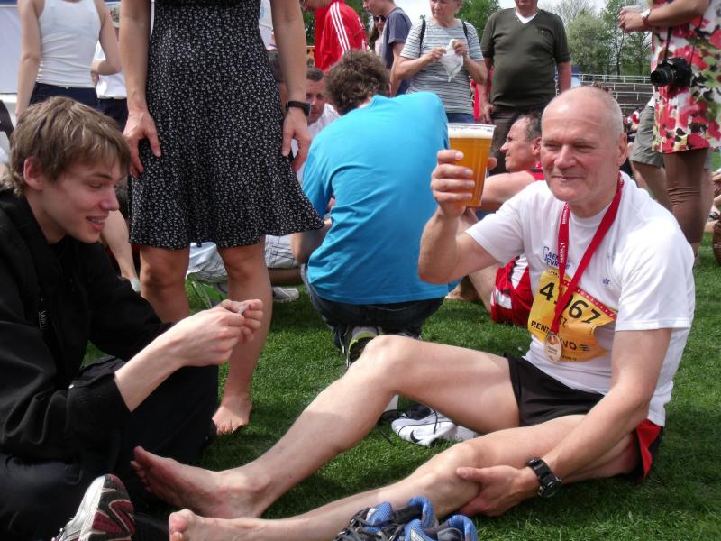 Die S-Bahn brachte die drei Marathonis und ihre Begleiter in das 42,2 Kilometer entfernte Königstein, inmitten der Sächsischen Schweiz. Nachdenkliche Blicke aus dem ewig fahrenden Zug ließen verkünden: „Das müssen wir dann alles zurücklaufen!“ Katrin Winkler-Hindricks hatte Ehemann Josef zum Fahrradfahren überreden können. An vorher abgesprochenen Treffpunkten wollte Josef nach dem rechten schauen. Die Gefährtinnen von Lutz Klauß und Dirk Meier nutzen den Service des Veranstalters und begleiteten das Marathonfeld mit einem historischen Schaufelraddampfer auf der Elbe. Der Elberadweg schlängelte sich am Elbsandsteingebirge entlang, mit ihm 990 Teilnehmer auf der Langdistanz. Eine malerische Landschaft die irgendwann zweitrangig wurde, denn auf den weiten Elbwiesen brachte nicht einmal der Rückenwind die ersehnte Abkühlung. Alle Getränkestände wurden angelaufen, Helfer verteilten Becherduschen auf die erhitzten Köpfe und erste Sirenen der Rettungswagen ließen nichts Gutes erahnen. Hindricks beschwor ihren Mann: „Mach schnell noch mal ein Foto, das wird das letzte sein, auf dem ich noch zu erkennen bin!“ Die wartenden Bode-Runners im Stadion machten sich Mut: „Alle drei sind erfahrene Marathonläufer, die stellen sich auf die heißen Temperaturen ein!“ Von daher hatte auch keiner bereits mit Dirk Meier gerechnet. Über Handy verkündete Börner: „Dirk kommt, Dirk ist da!“ Mit nur vier Minuten über seine Zielzeit zeigte Meier der Gluthitze die kalte Schulter. Als 37. von insgesamt 157 Frauen, folgte Hindricks rundum zufrieden und verkündete: „Der Lutz kommt gleich, ist dicht hinter mir!“ Die Schokolade hatte geholfen, denn auch Lutz Klauß hatte es geschafft. Das war ein hartes Stück Lauf!